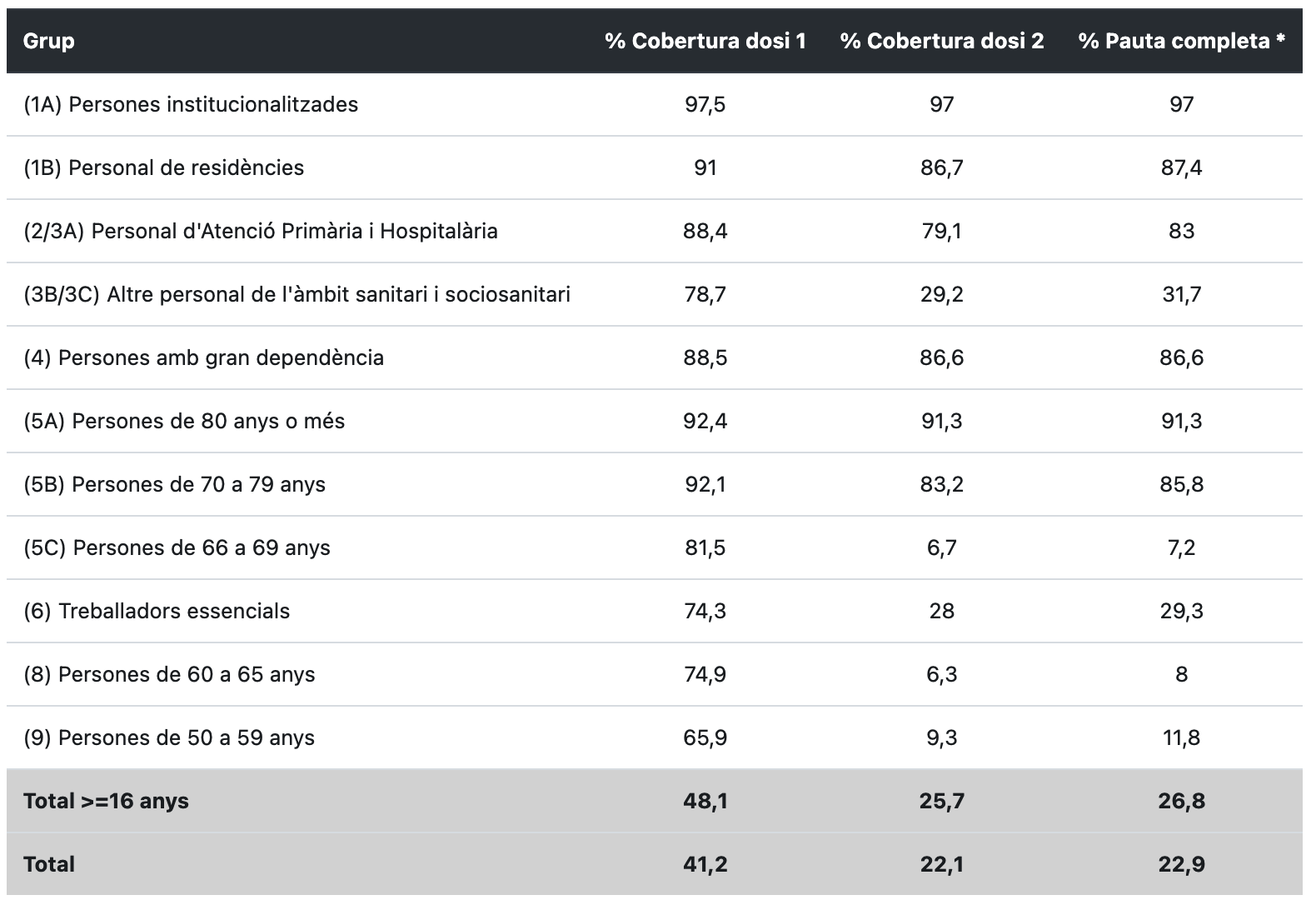A les Terres de l’Ebre no s’ha detectat cap nova mort i el total és de 179. Els vacunats de la primera dosi arriben a 74.372 (41,2%) i a 39.778 (22,1%) els vacunats de la segona i hi ha 41.390 persones amb la pauta completa (22,9%). Els vacunats de la primera dosi majors de 16 anys son el 48,1% i amb la pauta completa el 26,8%. El 65,9% de la població ebrenca de 50 a 59 anys ja s’ha vacunat amb una dosi.