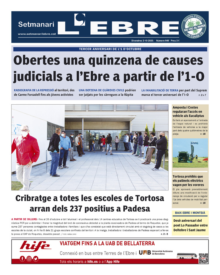 La portada de l’edició en paper número 949 del Setmanari L’EBRE repartix el pes entre una radiografia de la quinzena de causes judicials que continuen vives al territori vinculades d’alguna manera a l’1 d’Octubre, tema protagonista de la Primera Plana de la publicació en què s’analitza en quin punt es troben els procediments judicials, i el cribratge als 14 centres escolars de Tortosa arran dels 237 positius detectats en el brot de coronavirus de la planta escorxadora de Padesa. La imatge, de fet, és per als treballadors i treballadores de Padesa esperant a fer-se una PCR a l’exterior del CAP de Roquetes, amb motiu del segon cribratge massiu que s’ha fet a l’empresa des del juliol.