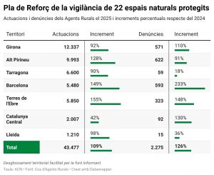 El reforç de la vigilància als espais naturals ha duplicat en un any les actuacions d’aquesta mena als espais naturals amb protecció oficial, que han passat de 20.807 l’any 2024 a 42.477, el 2025. Els increments més significatius s’han produït en espais naturals de les Terres de l’Ebre (de 2.296 a 5.850) i a l’àrea de Barcelona (de 2.204 a 5.480).