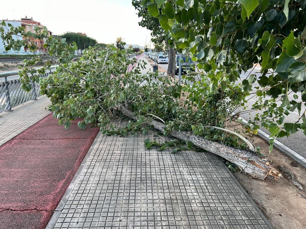 Una palmera del parc Teodor González es va precipitar sobre la vorera de l’avinguda Generalitat, prop de les escales d’accés al recinte, i també van col·lapsar altres arbres al barri del Temple o Ferreries. També va fer caure un post de suport de la línia d’enllumenat a Sant Josep de la Muntanya. Els tècnics municipals han retirat ja bona part de l’arbrat arrencat i treballen per reparar totes les incidències de l’episodi en les pròximes hores.