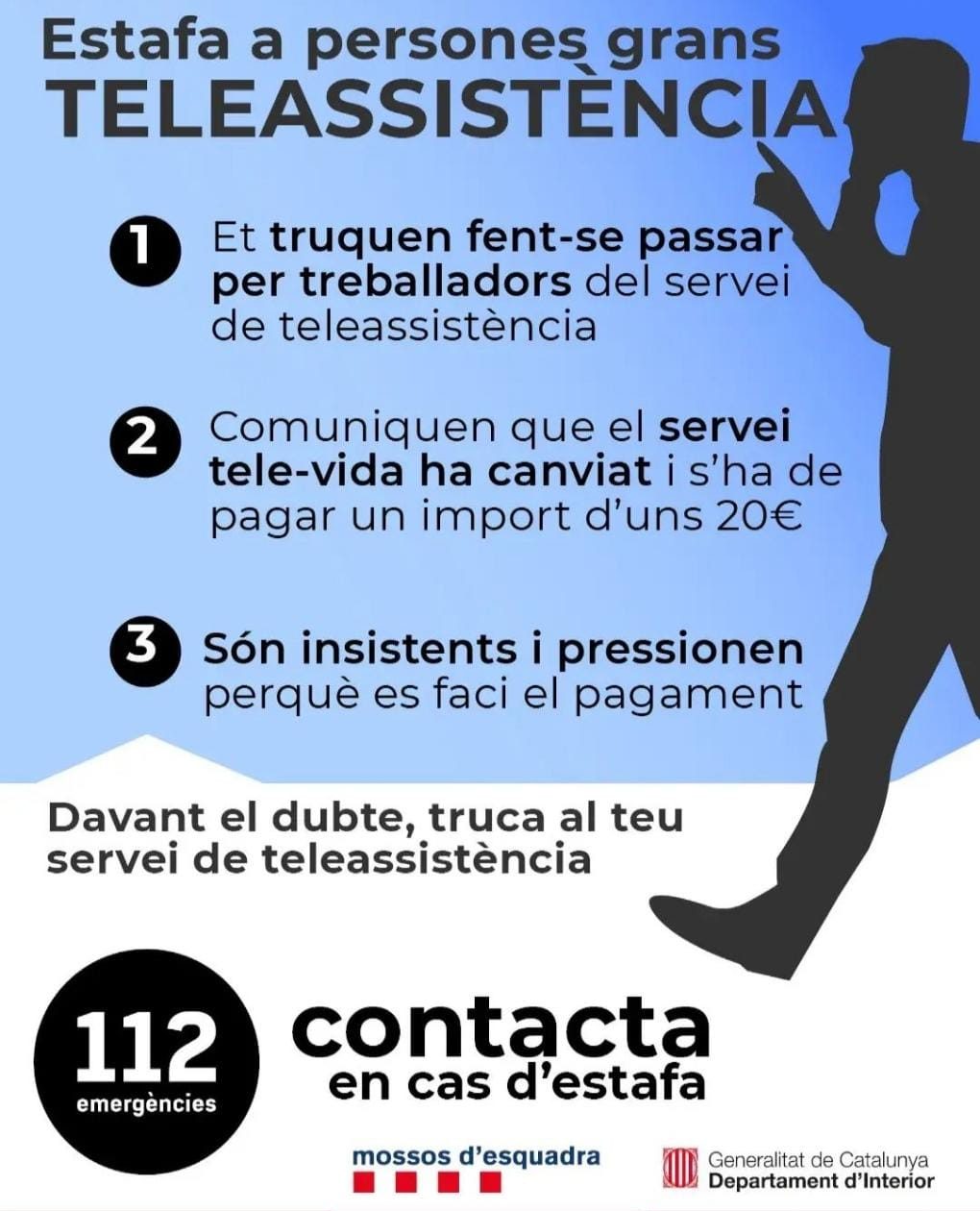 Els Mossos d’Esquadra, fent consells per prevenir estafes, recorda que no s’ha de fer cap pagament ni facilitar dades personals ni bancàries per telèfon i recomana contactar amb el servei de teleassistència que es té contractat per verificar la informació i avisar immediatament trucant al 112.