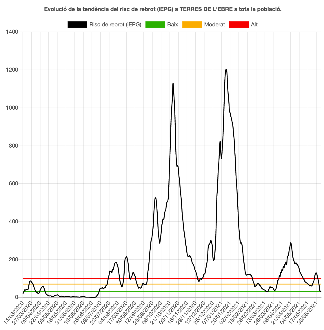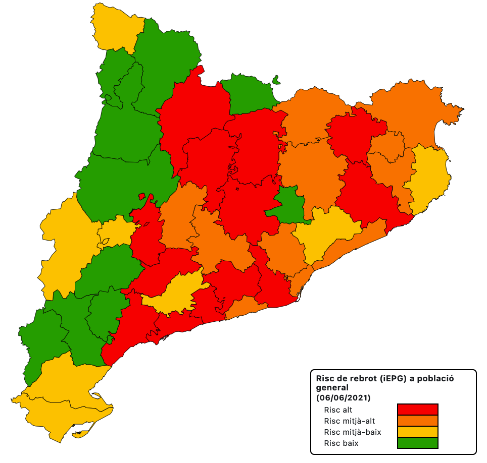 La velocitat de propagació de la Covid-19 (Rt) puja a 0,53 a les Terres de l’Ebre, set centèsimes més que ahir, però com és inferior a l’1 significa que la pandèmia decreix. El risc de rebrot també puja una mica i ho fa 3 punts fins a 34 (mitjà-baix). Per comarques, el risc de rebrot és baix a la Terra Alta amb 0 punts i a la Ribera d’Ebre amb 10 punts, mitjà-baix al Montsià amb 45 i al Baix Ebre amb 44 punts.