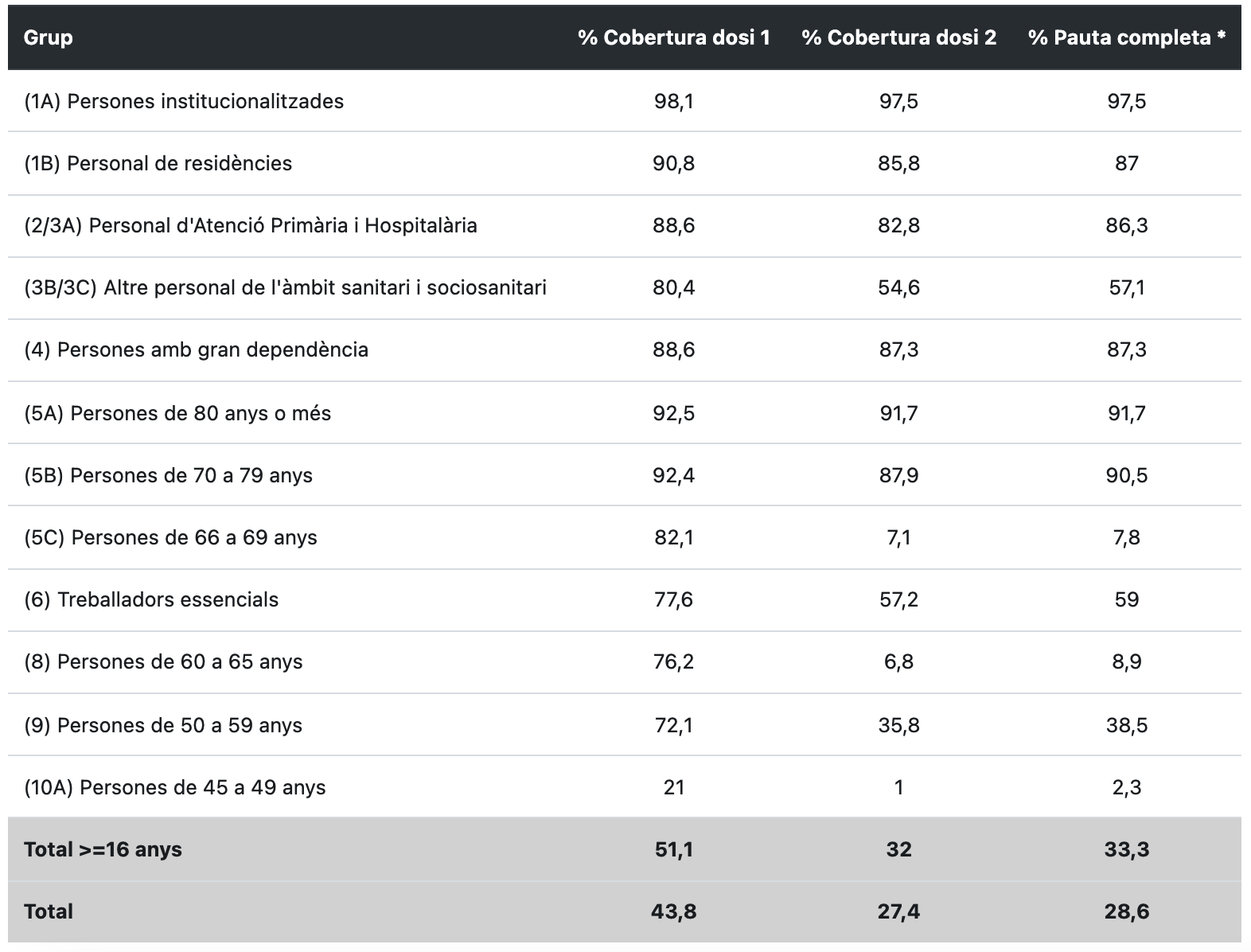 Els vacunats de la primera dosi arriben a les Terres de l’Ebre a 79.076 (43,8%) i a 49.482 (27,4%) els vacunats de la segona i hi ha 51.599 persones amb la pauta completa (28,6%), segons dadescovid.cat. Els vacunats de la primera dosi majors de 16 anys son el 51,1% i amb la pauta completa el 33,3%. El 72,1% de la població ebrenca de 50 a 59 anys ja s’ha vacunat amb una dosi.