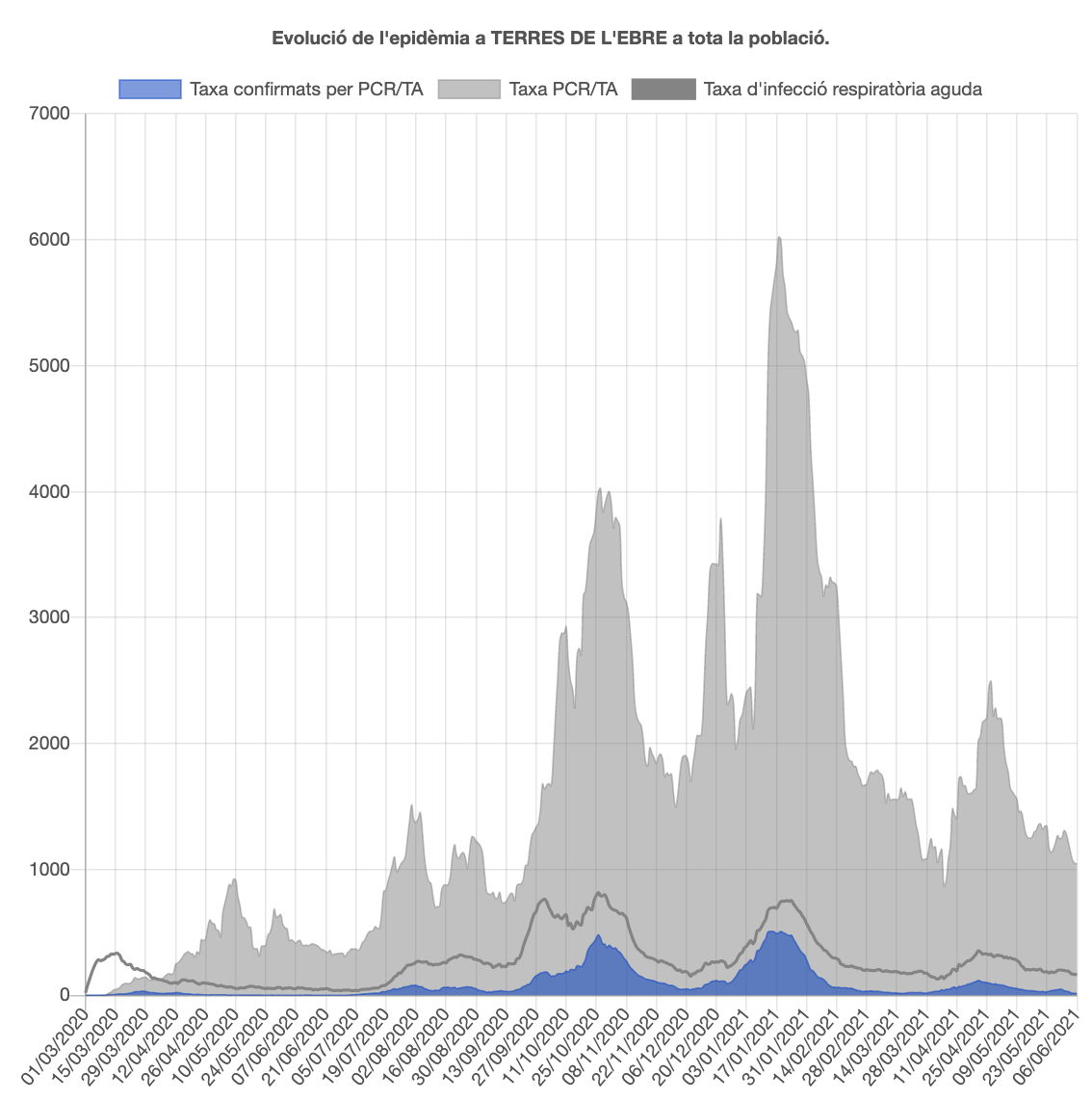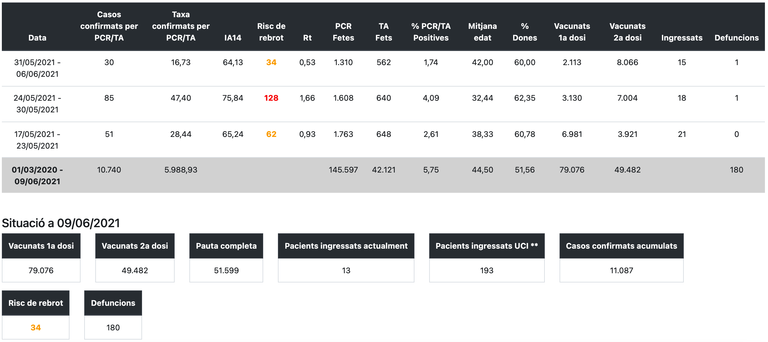 La taxa de confirmats per PCR o TA entre el 31 de maig i el 6 de juny és de 17 per cada 100.000 habitants i durant aquest període s’han detectat 30 positius, menys que la setmana anterior quan se’n van detectar 85. A hores d’ara l’1,74% de les proves que es fan donen positiu.