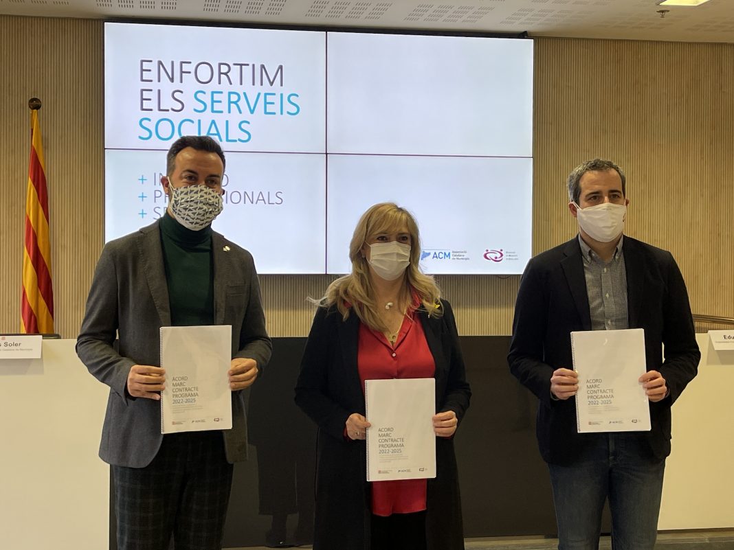 El Departament de Drets Socials, l’Associació Catalana de Municipis (ACM) i la Federació de Municipis de Catalunya (FMC) han signat aquesta setmana l’acord marc per a la coordinació, la cooperació i la col·laboració entre l’administració de la Generalitat i els ens locals en matèria de serveis socials i altres programes de protecció social per al període 2022-2025. Aquest acord marc inclou les principals línies d’actuació per als propers quatre anys i es traduirà en un contracte programa amb els diferents ens locals per un total de 1.408 milions d’euros. Per a 2022, es contempla un increment de 76’5 milions d’euros per part del Departament, fins arribar a un total de 320 milions d’euros.