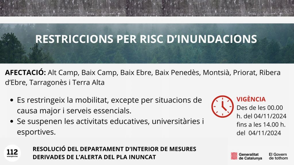 La consellera de la Generalitat, Núria Parlon, ha informat que demà dilluns, 4 de novembre, la mobilitat no necessària quedarà restringida a nou comarques de Catalunya, d’entre les que hi ha les 4 comarques ebrenques. Les comarques són: Ribera d’Ebre, Baix Ebre, Montsià, Terra Alta, Priorat, Tarragonès, Baix Camp, Alt Camp i Baix Penedès.
