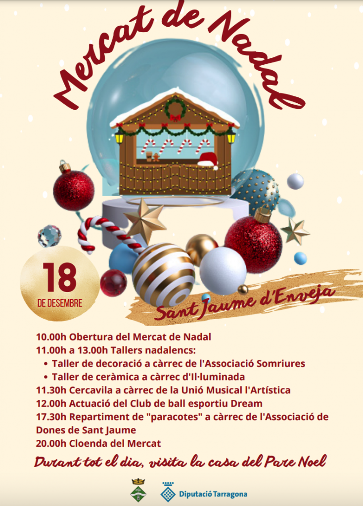 Com cada any, l’Ajuntament de Sant Jaume d’Enveja ha organitzat el Mercat de Nadal. Aquest passat diumenge, dia 18 de desembre, s’ha celebrat aquesta jornada a la localitat que apropa el Nadal als veïns i les veïnes del municipi. El mercat, situat a la plaça 23 de juny, ha rebut la visita de moltes persones que han acompanyat els estands dels comerços i associacions.