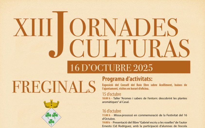 El poble de Freginals es prepara per celebrar, un any més, les Jornades Culturals del 16 d’octubre, una cita molt esperada que omplirà el municipi d’activitats culturals i festives durant cinc dies consecutius. El programa inclou tallers, presentacions de llibres, recitals de poesia, projeccions de cinema, concerts i visites guiades, amb l’objectiu de reivindicar la cultura i les tradicions locals.