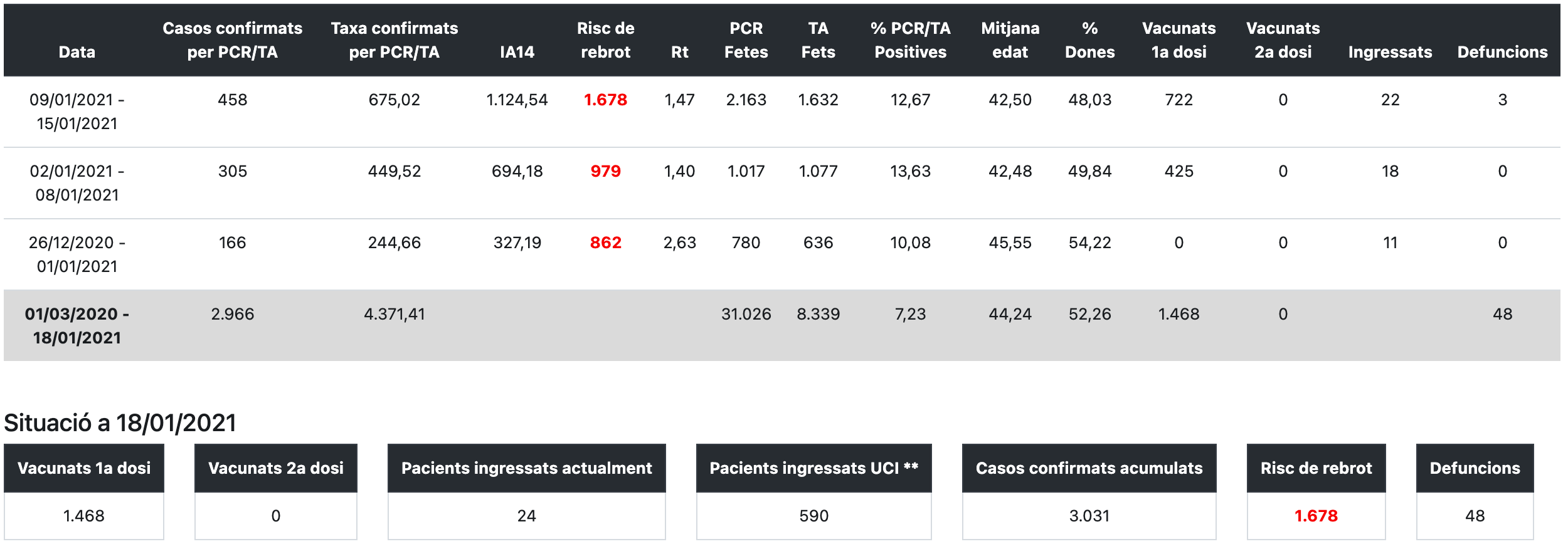 La taxa de confirmats per PCR o tests d’antígens entre el 9 i el 15 de gener és de 675,02 per cada 100.000 habitants. El 12,67% de les proves de la darrera setmana han donat positiu. D’altra banda, s’han declarat en tota la pandèmia 48 defuncions per Covid-19. Hi ha 24 pacients ingressats als hospitals. Entre el 9 i el 15 de gener hi havia 22 ingressats, pels 18 de la setmana anterior. Els vacunats arriben a 1.468.