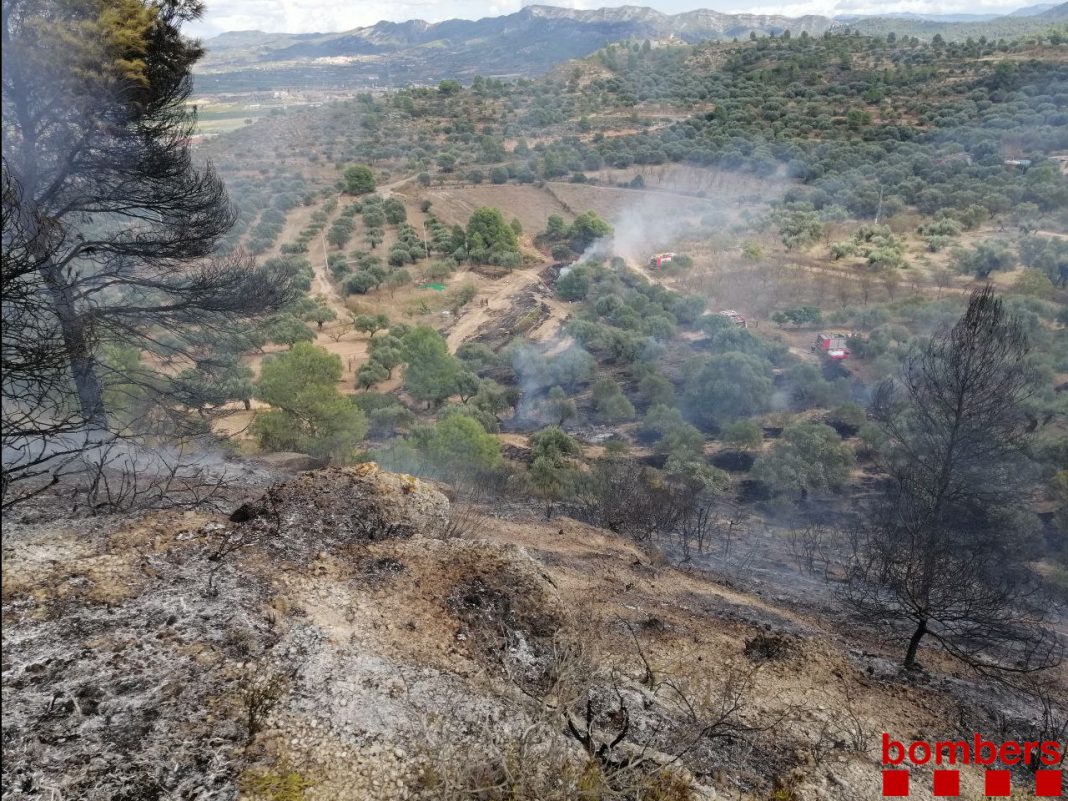 Els Bombers han traslladat al lloc dels fets 7 dotacions terrestres i dues d’aèries. L’incendi afectaria vegetació agrícola, ferralla i també altres materials que a hores d’ara es desconeixen. A més, a la part baixa del terreny hi ha una plantació d’oliveres. El cos de Bombers apunta que el foc ha quedat controlat sobre les cinc de la tarda. Segons informacions provisionals dels Agents Rurals el foc hauria afectat 8.000 metres quadrats de massa forestal i oliveres.