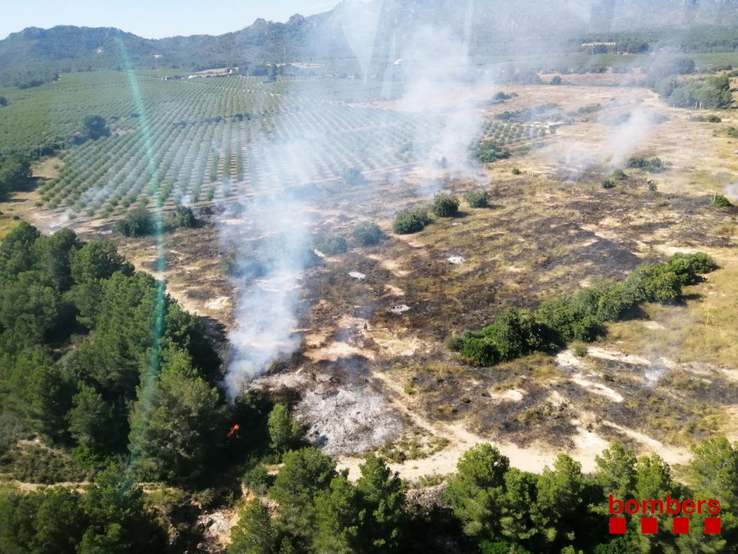 El foc ha anar cremant ràpidament i les flames han anat a parar a un barranc i els Bombers han activat dos helicòpters i set dotacions terrestres dels parcs de l’Ametlla i Tortosa.