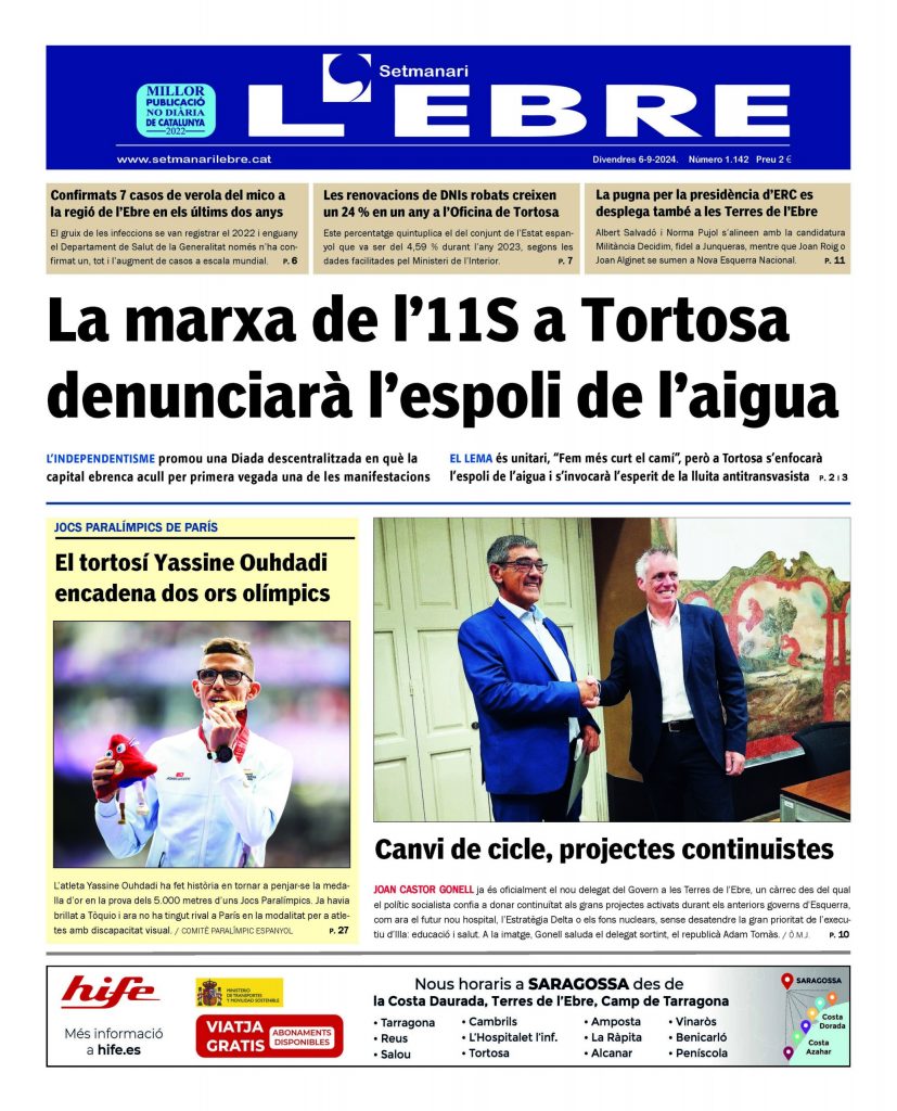 La portada de l’edició en paper número 1.142 del Setmanari l’Ebre dedica el titular principal a escalfar la manifestació independentista prevista a Tortosa l’Onze de Setembre, en una Diada que el sobiranisme ha volgut descentralitzar amb marxes a les quatre capitals provincials i a la capital ebrenca. Les imatges de la setmana a la portada són per a Joan Castor Gonell, agafant el relleu d’Adam Tomàs a la Delegació del Govern a l’Ebre, i per a l’atleta tortosí amb discapacitat visual Yassine Ouhdadi, medalla d’or en els 5.000 m. dels Jocs de Paris, on va repetir així l’èxit assolit ja a Tòquio.