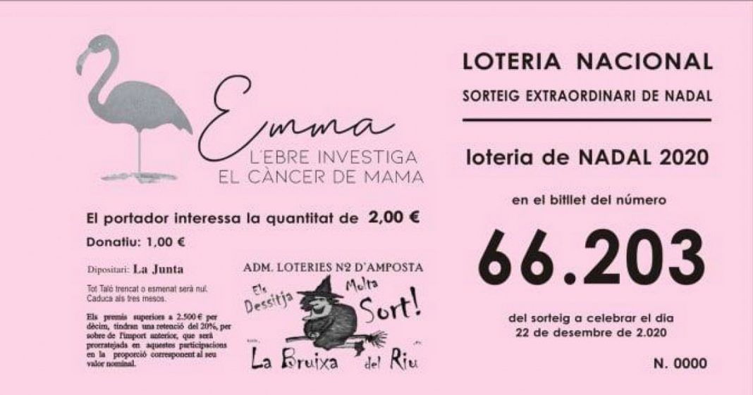 El propietari de l’administració N. 2 de loteria d’Amposta (La Bruixa del Riu), Agustí Centellas, ha fet participacions del número 66.203 de la Loteria de Nadal amb l’objectiu de contribuir a recaptar fons per al projecte Emma, que investiga el càncer de mama. La impressió de les participacions les ha fet Pixpress, empresa d’arts gràfiques d’Amposta, que també contribueix en aquesta iniciativa amb la seva col·laboració solidària.