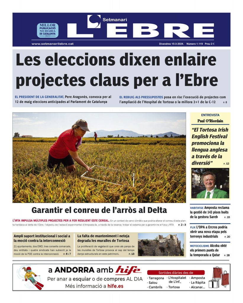 El Setmanari l’Ebre obre esta setmana la seua edició en paper amb la convocatòria d’eleccions anticipades al Parlament de Catalunya a conseqüència del rebuig parlamentari al projecte de llei de pressupostos de la Generalitat per a 2024. Un rebuig que dixa enlaire projectes claus per a les Terres de l’Ebre com l’ampliació de l’Hospital de Tortosa Verge de la Cinta o la millora de l’Eix de l’Ebre. L’ampli suport institucional i social que ha aconseguit la moció de la PDE en contra de la interconnexió de xarxes i la degradació que pateixen les muralles de Tortosa a conseqüència de la vegetació que arrela als panys de paret són altres notícies que es destaquen a la portada.