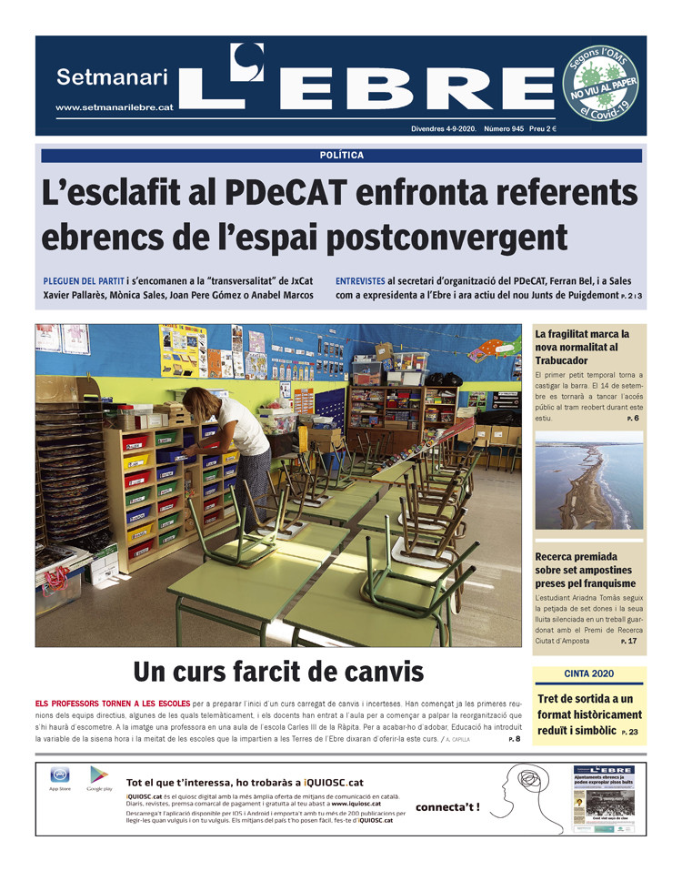 La portada i la primera plana de l’edició en paper número 945 del Setmanari L’EBRE furguen i analitzen la trencadissa, amb entrevistes amb Bel i amb Sales per donar veu a les dos posicions ara ja sembla que irreconciliables: els lleials al PDeCAT i els que fan el pas cap al nou Junts de Carles Puigdemont.