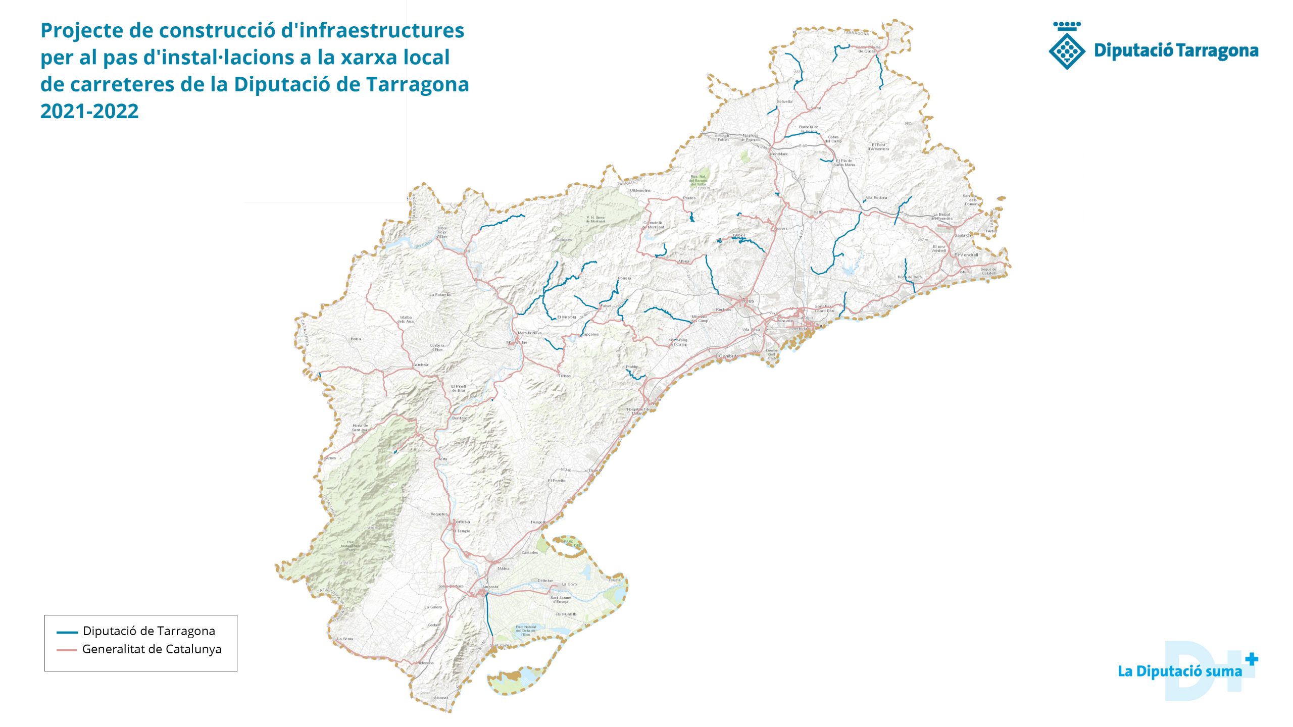 Els municipis als quals es construiran les canalitzacions per al pas d’instal·lacions aquest 2022 són: Caseres (Terra Alta), Darmós a Tivissa (Ribera d’Ebre), la Palma d’Ebre (Ribera d’Ebre), Paüls (Baix Ebre), La Ràpita (Montsià), l’Albiol (Baix Camp), l’Aleixar (Baix Camp), Arbolí (Baix Camp), l’Argentera (Baix Camp), Barberà de la Conca (Conca de Barberà), Bonastre (Baix Penedès), Bellmunt del Priorat (Priorat), Conesa (Conca de Barberà), Duesaigües (Baix Camp), Forès (Conca de Barberà), La Figuera (Priorat), La Febró (Baix Camp), Els Garidells (Alt Camp), Gratallops (Priorat), La Juncosa de Montmell (Baix Penedès), El Lloar (Priorat), Masllorenç (Baix Penedès), Maspujols (Baix Camp), El Masroig (Priorat), El Molar (Priorat), Montbrió del Camp (Baix Camp), Mont-ral (Alt Camp), Passanant i Belltall (Conca de Barberà), El Pla de Santa Maria (Alt Camp), Pontils (Conca de Barberà), Porrera (Priorat), Pradell de la Teixeta (Priorat) Pratdip (Baix Camp), Renau (Tarragonès), Riudecanyes (Baix Camp), Roda de Berà (Tarragonès), Savallà del Comtat (Conca de Barberà), La Secuita (Tarragonès), Solivella (Conca de Barberà), Torroja del Priorat (Priorat), Vilaplana (Baix Camp).