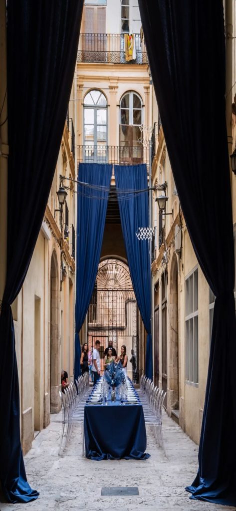 De contrastos va la intensitat, com de contrastos va la selecció del color blau d’aquesta proposta. La unanimitat de tons i la precisa composició dels elements doten de qualitat al conjunt. Com qui es vesteix amb les millors robes per a un esdeveniment important, aquesta taula i els seus comensals engalanen el passatge Franquet amb la Festa blava.
