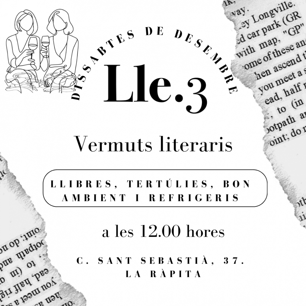 La llibreria Lle.3 de la Ràpita ha programat per al proper mes de desembre la primera edició dels Vermuts Literaris, obert a tot el públic, amb l’objectiu «de dinamitzar Lle.3 amb l’organització de diverses presentacions de llibres que consoliden la idea amb què neix el projecte, a més d’una llibreria, un espai de foment de la lectura, dels llibres i la cultura en general» – explica la propietària, Àngels Caparrós, que afegeix «a més encetem el cicle amb autores i autors rapitencs, la qual cosa em fa una il·lusió especial, perquè, d’un banda, són una mostra del talent i el potencial humà i professional que tenim a la Ràpita i, de l’altra, posem el nostre granet d’arena per a fer difusió de les seues obres. Amb tot, seguim treballant per a què els propers cicles puguem consolidar la programació i fer-ho també amb autores i autors de les Terres de l’Ebre, i més enllà».