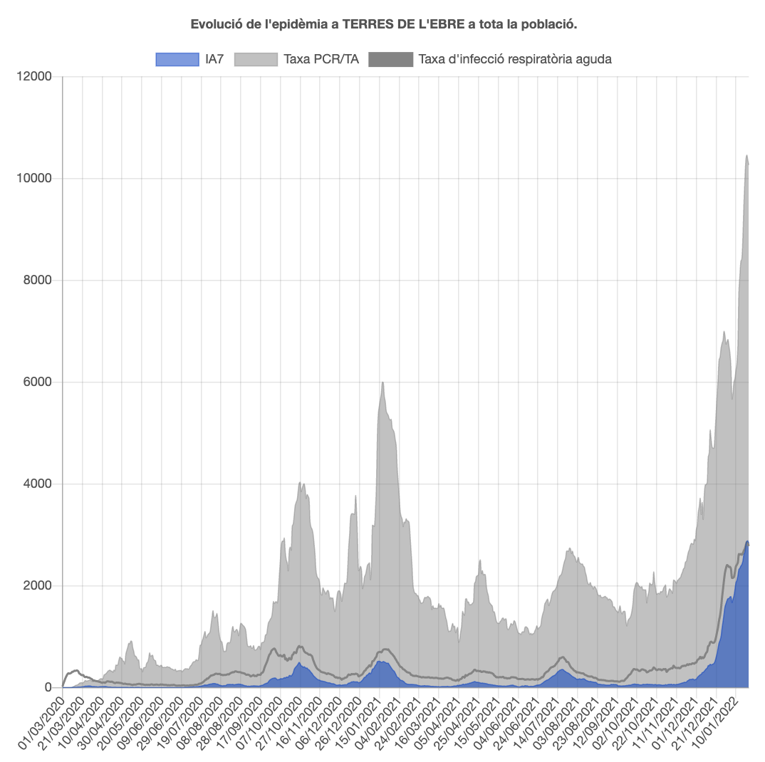 Entre el 17 i el 23 gener, que és l’última setmana de la qual es tenen dades fiables, es van registrar 5.119 casos, més que la setmana anterior, quan se’n van detectar 4.366. Per comarques, el Baix Ebre ha registrat l’última setmana 2.409 positius, el Montsià 1.979, la Terra Alta 331 i la Ribera d’Ebre 494.