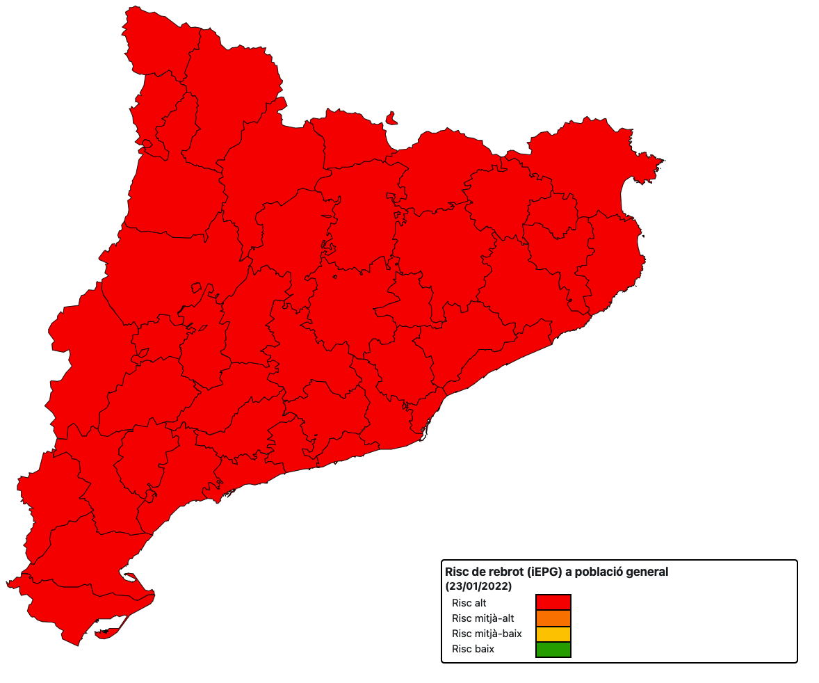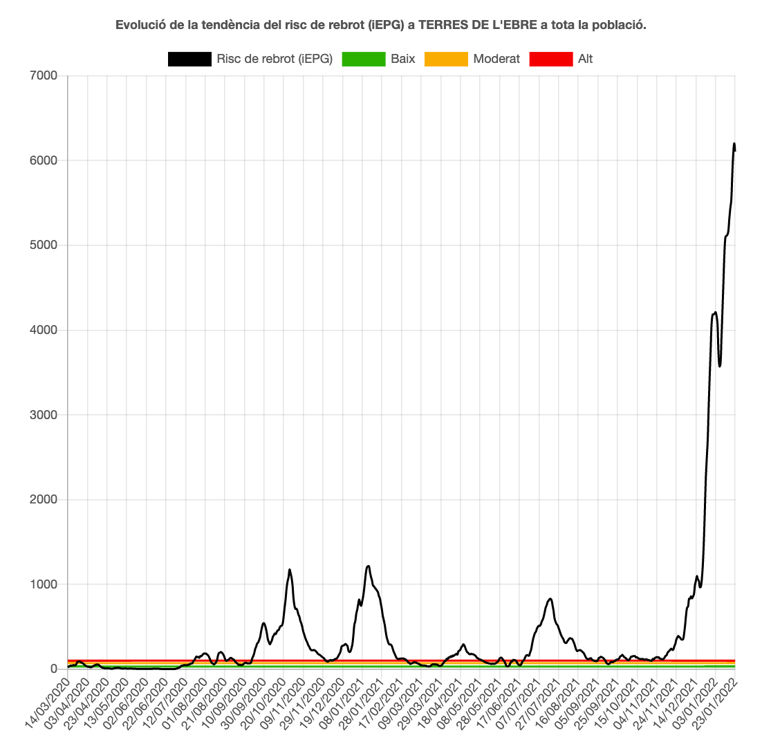 La pandèmia segueix en augment, ja que la velocitat de contagi (Rt) supera l’1, però baixa una centèsima fins a l’1,16. El risc de rebrot també baixa i ho fa 51 punts fins a 6.105 (risc molt alt). Tenen un risc molt alt les quatre comarques: la Ribera d’Ebre de 5.850, el Montsià de 5.648, la Terra Alta de 5.882 i el Baix Ebre de 6.758.