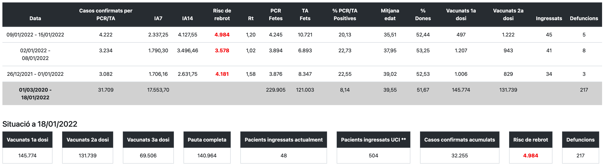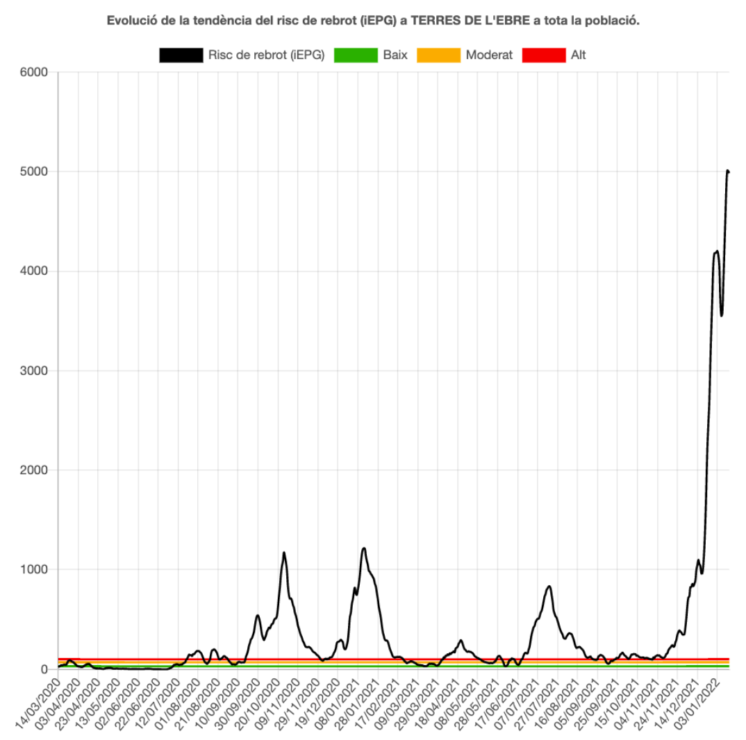 La pandèmia segueix en augment, ja que la velocitat de contagi (Rt) supera l’1, però baixa tres centèsimes fins a 1,20 i el risc de rebrot puja 22 punts, fins a 4.984 (risc molt alt). Tenen un risc molt alt les quatre comarques: la Ribera d’Ebre de 2.847, el Montsià de 5.702, la Terra Alta de 4.973 i el Baix Ebre de 4.982.
