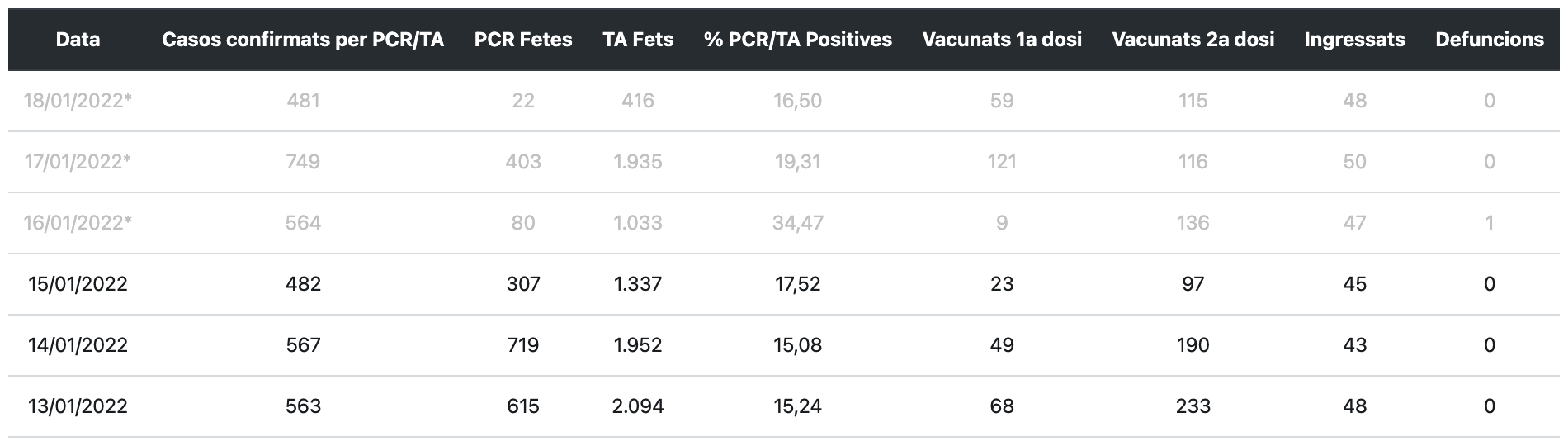 Segons dadescovid.cat, actualment hi ha 60 persones ingressades per Covid-19, una menys que ahir, 12 de les quals a l’UCI. A les Terres de l’Ebre han mort 217 persones des de l’inici de la pandèmia, cinc més. Les últimes defuncions daten del 12 i el 16 de gener. La incidència a 7 dies és de 2.337 i a 14 dies és de 4.128. El 20,13% de les proves que es fan donen positiu.