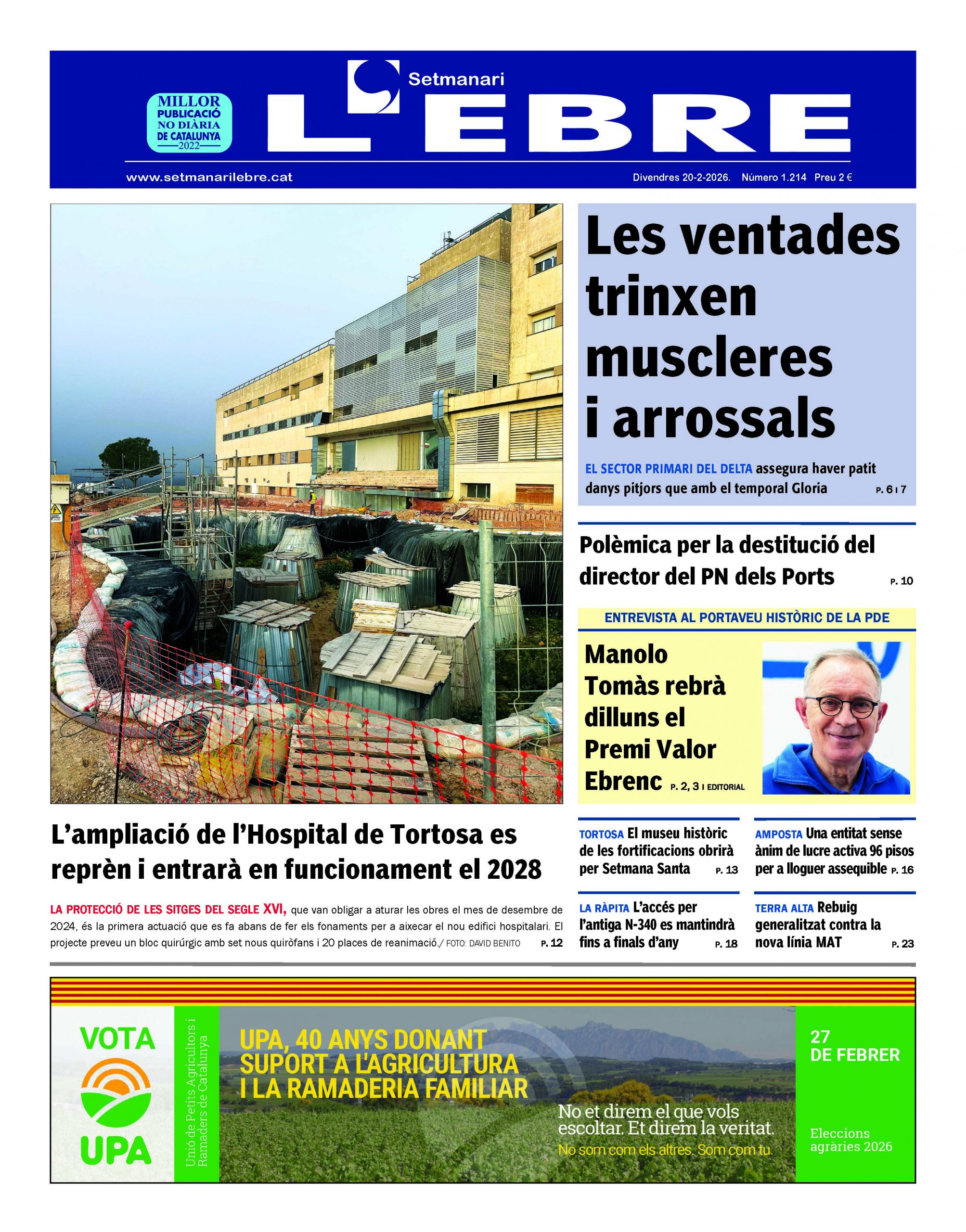 La portada de l’edició en paper número 1214 del Setmanari l’Ebre dedica el titular principal de portada a l’impacte que la ventada del 14 de febrer, embolcallada de polèmica per la gestió dels avisos d’emergència que en va fer el Govern de la Generalitat, va provocar al sector primari del delta de l’Ebre. El vent i les fortes onades van trencar muscleres i van envair arrossars i el Govern s’ha compromés a quantificar bé els danys i activar ajuts específics.