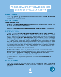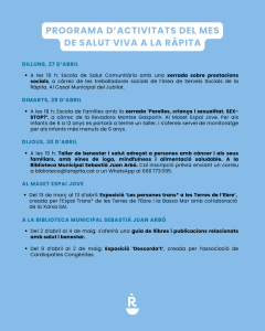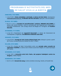 Al llarg del mes d’abril, el programa es completa amb exposicions, xerrades, activitats educatives, espais de salut comunitària i accions de sensibilització com la commemoració del Dia Mundial de la Salut o del Dia Mundial de conscienciació sobre l’autisme. També s’han programat activitats a la biblioteca, al Casal del Jubilat i a l’Espai Jove, així com entrevistes i accions divulgatives.