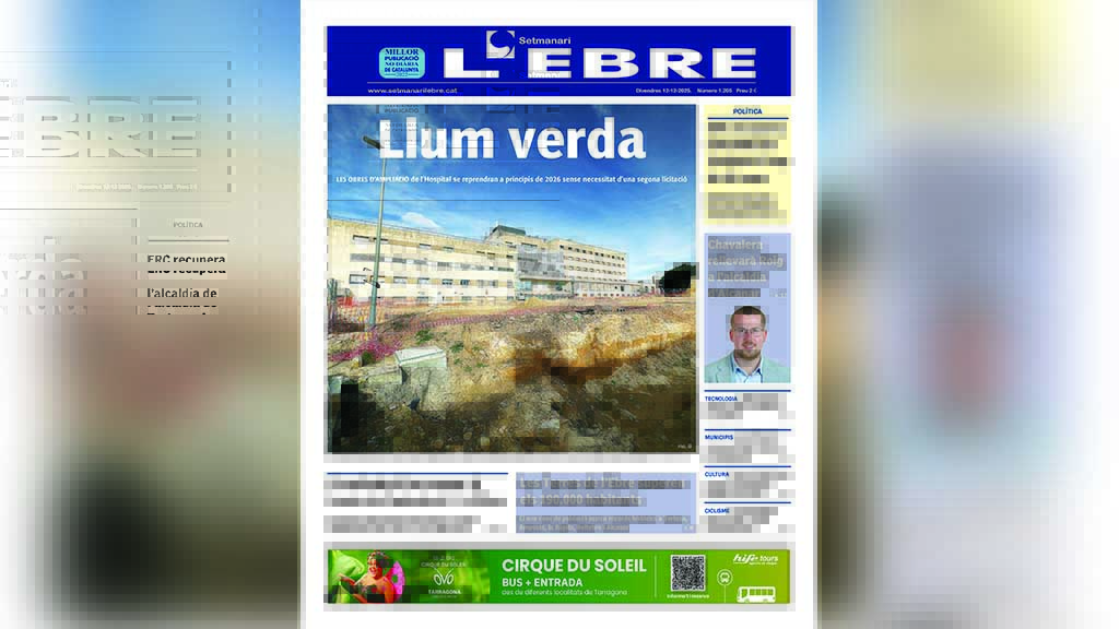 La portada de l’edició en paper número 1.205 del Setmanari l’Ebre dedica el titular i la imatge principals a la represa imminent de les obres d’ampliació de l’Hospital Verge de la Cinta de Tortosa, una volta la Comissió de Patrimoni de les Terres de l’Ebre ha donat el vistiplau a la reformulació del projecte per a protegir les restes arqueològiques que van aparéixer ara fa un any i un acord amb l’empresa adjudicatària evitar que s’haja de fer una nova licitació.