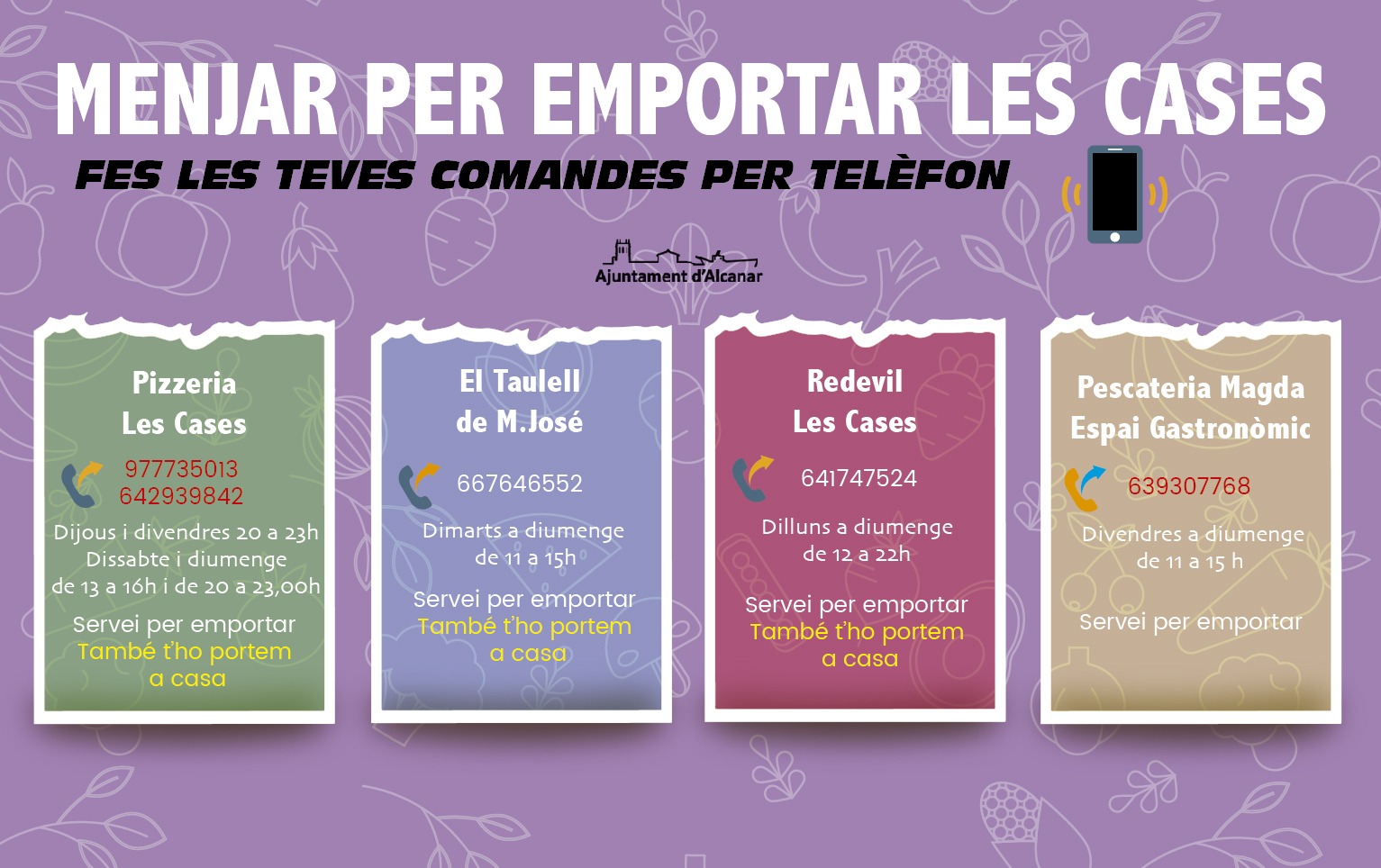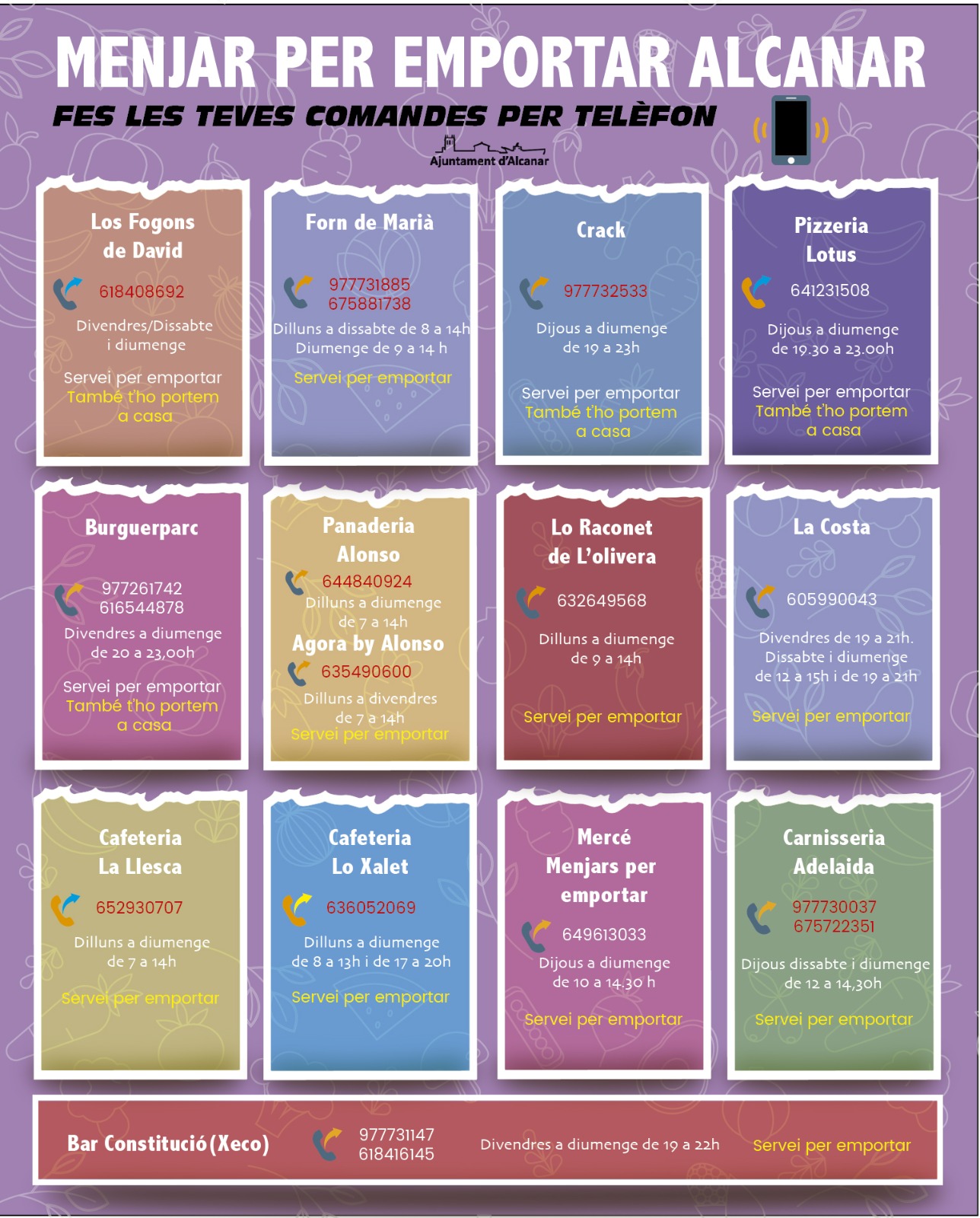 Es poden consultar quins establiments ofereixen aquests serveis a les xarxes socials de l’Ajuntament d’Alcanar, que va renovant la información cada cop que s’adhreixen més negocis.
