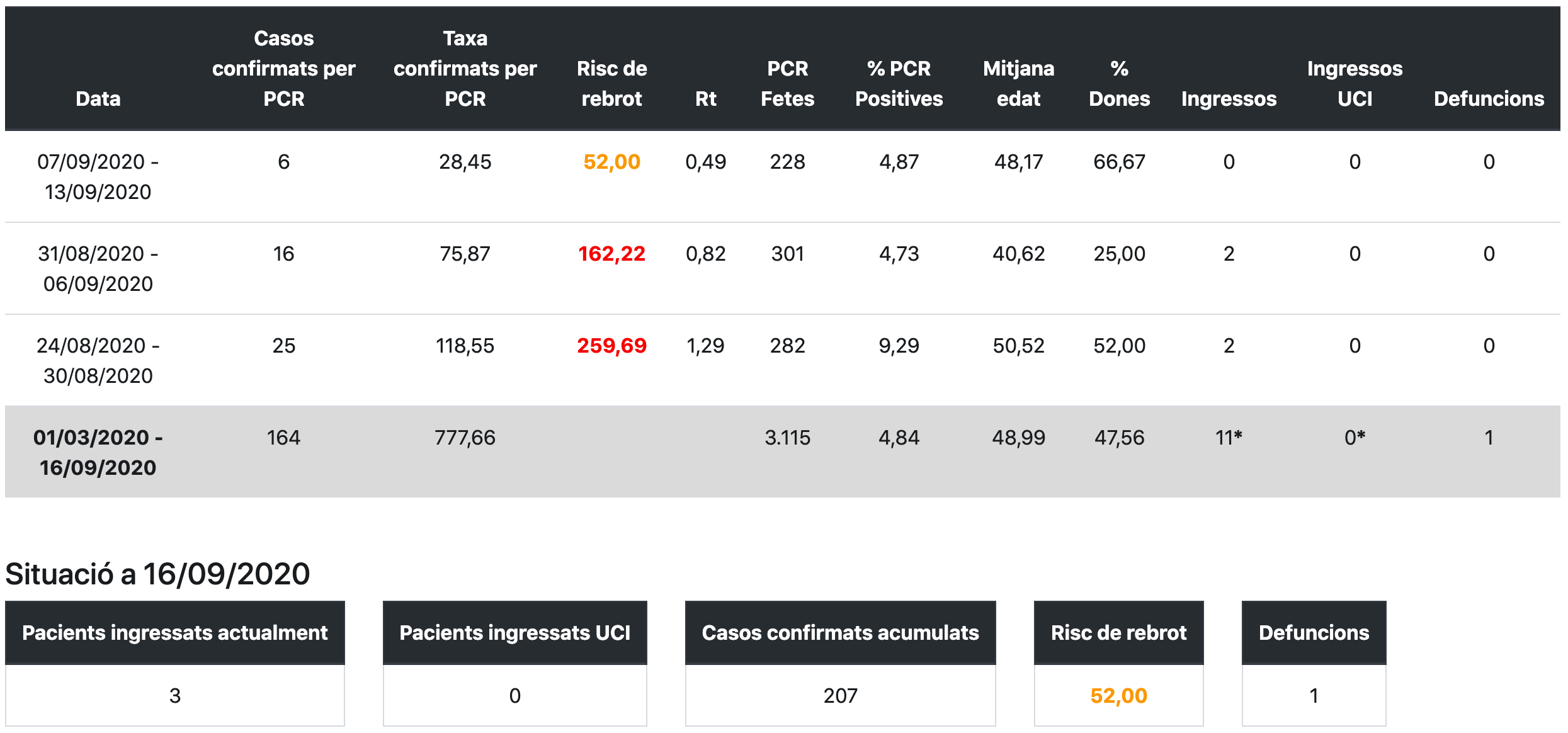 La Ribera d’Ebre acumula, des de l’inici de la pandèmia, 164 casos confirmats per PCR i 207 si es tenen en compte la resta de proves, és a dir, 1 més respecte les dades d’ahir. En aquesta comarca ha mort una persona en total. El risc de rebrot té una clara tendència a la baixa des de finals d’agost i actualment és de 52,00. Per altra banda, la taxa de confirmats per PCR en els darrers set dies és de 28,45 per 100.000 habitants, mentre que l’Rt, és a dir, la velocitat de propagació del virus és de 0,49. Segons aquest últim balanç hi ha tres persones ingressades als hospitals, cap d’elles a l’UCI.