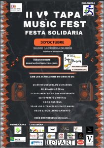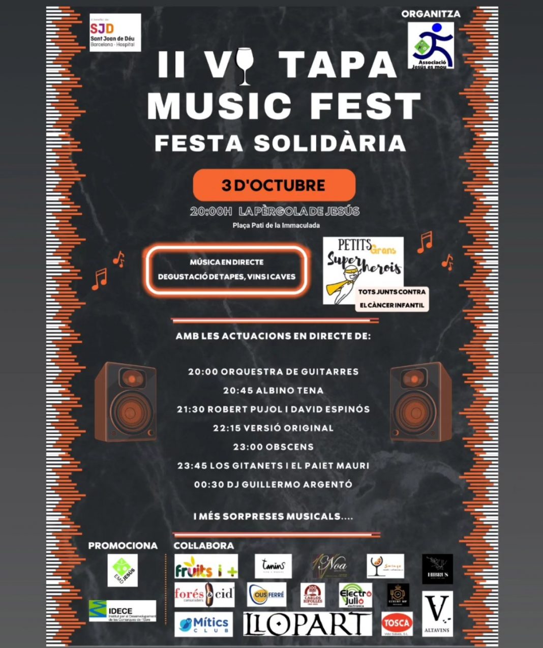 La segona edició del Vi Tapa Music Fest, organitzat per l’Associació Jesús es mou, se celebrarà aquest divendres 3 d’octubre a la Pèrgola dins del programa de les Festes de Sant Francesc. Es tracta d’una festa solidària que uneix música i gastronomia per recaptar fons destinats a la investigació del càncer infantil.