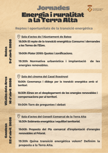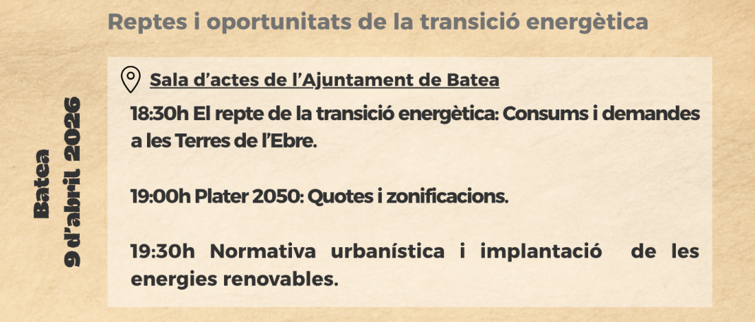 El Consell Comarcal de la Terra Alta organitza les jornades ‘Energia i ruralitat a la Terra Alta. Reptes i oportunitats de la transició energètica‘, que tindran lloc els dies 9, 16 i 22 d’abril als municipis de Batea, Vilalba dels Arcs i Gandesa, respectivament.