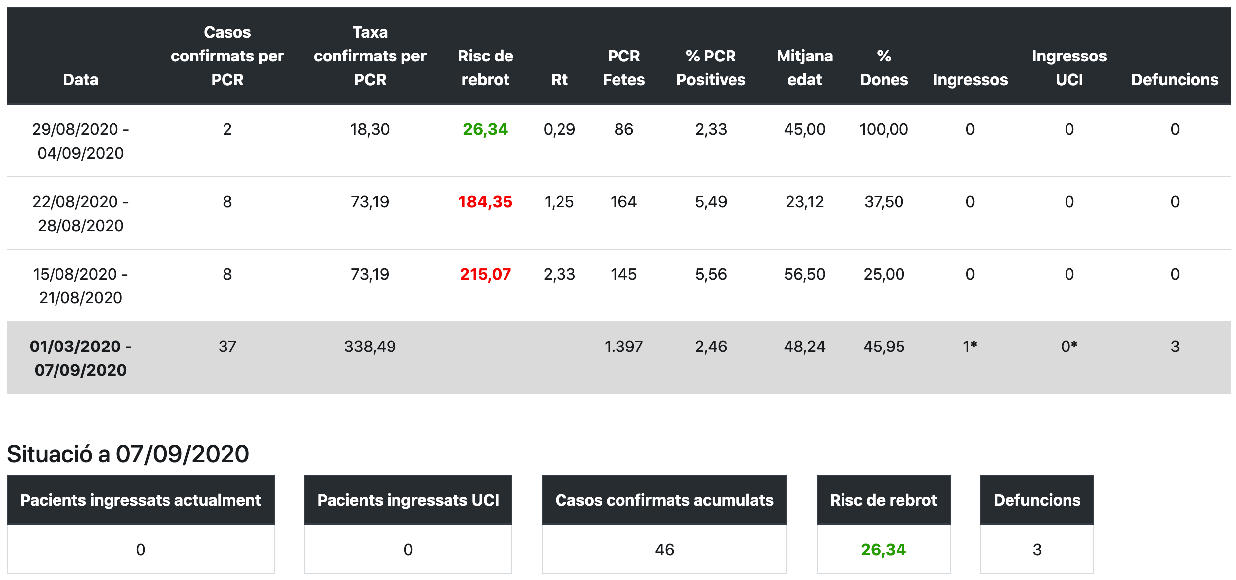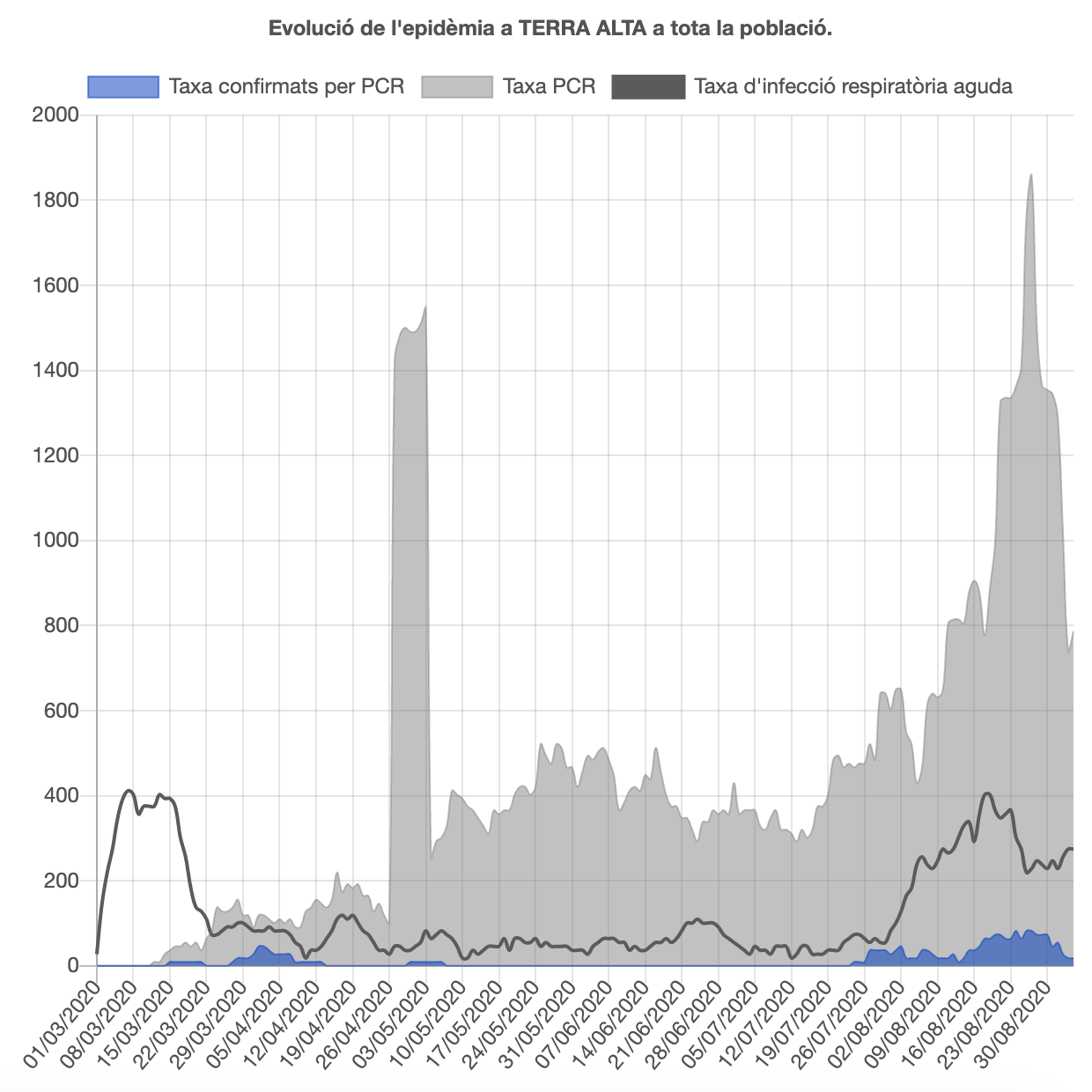 La comarca de la Terra Alta acumula, des de l’inici de la pandèmia, 37 casos confirmats per PCR i 46 si es tenen en compte la resta de proves, un més que en el balanç anterior. En aquesta comarca han mort 3 persones en total. El risc de rebrot se situa per sota del 30, a 26,43, i aquestes dades no es veien des del passat 13 d’agost, fa gairebé un mes. Per altra banda, la taxa de confirmats per PCR en els darrers set dies és de 18,30 per 100.000 habitants, mentre que l’Rt, la taxa de reproducció del virus, segueix baixant fins a 0,27. Segons aquest últim balanç no hi ha cap persona ingressada a l’hospital.