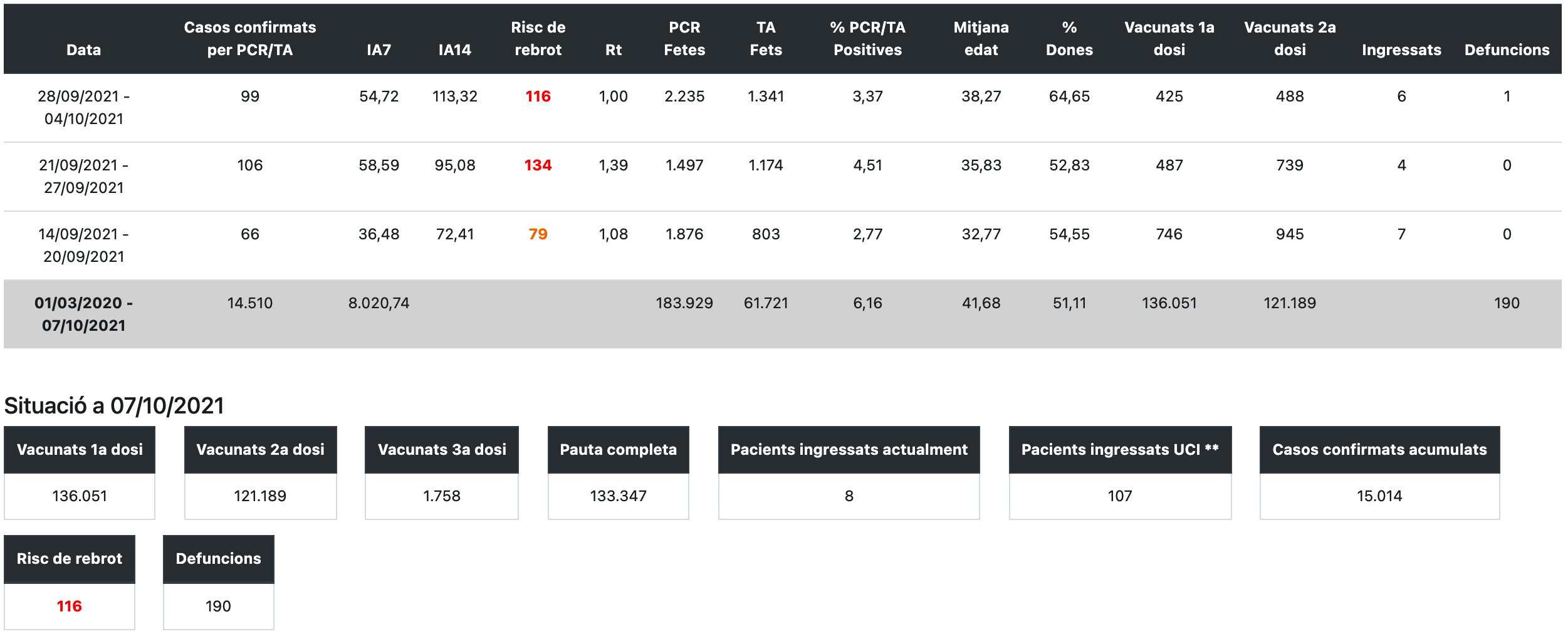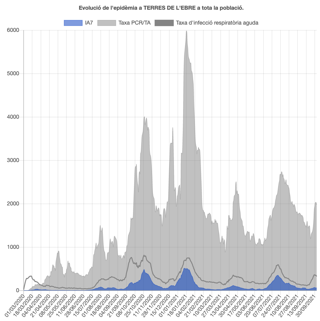 Segons dadescovid.cat, hi ha 12 persones ingressades per Covid-19, una més que ahir, 4 de les quals a l’UCI. A les Terres de l’Ebre han mort 190 persones des de l’inici de la pandèmia, cap més. Les dues últimes defuncions daten de l’11 i del 30 de setembre. La incidència a 7 dies és de 55 i a 14 dies és de 113. El 3,37% de les proves que es fan donen positiu.