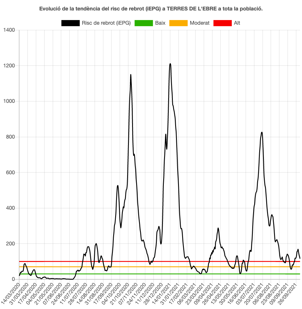 La velocitat de contagi (Rt) baixa nou centèsimes fins a 1. El risc de rebrot també baixa i ho fa 10 punts fins a 116, risc alt. Té un risc baix la Ribera d’Ebre (30), mitjà-baix el Montsià (54), alt el Baix Ebre (176) i molt alt la Terra Alta (307).