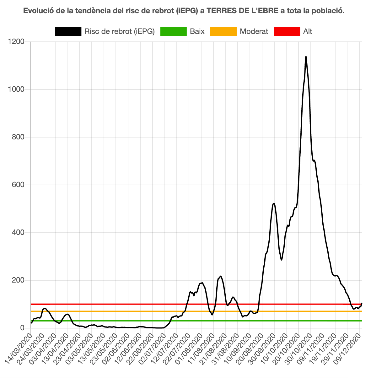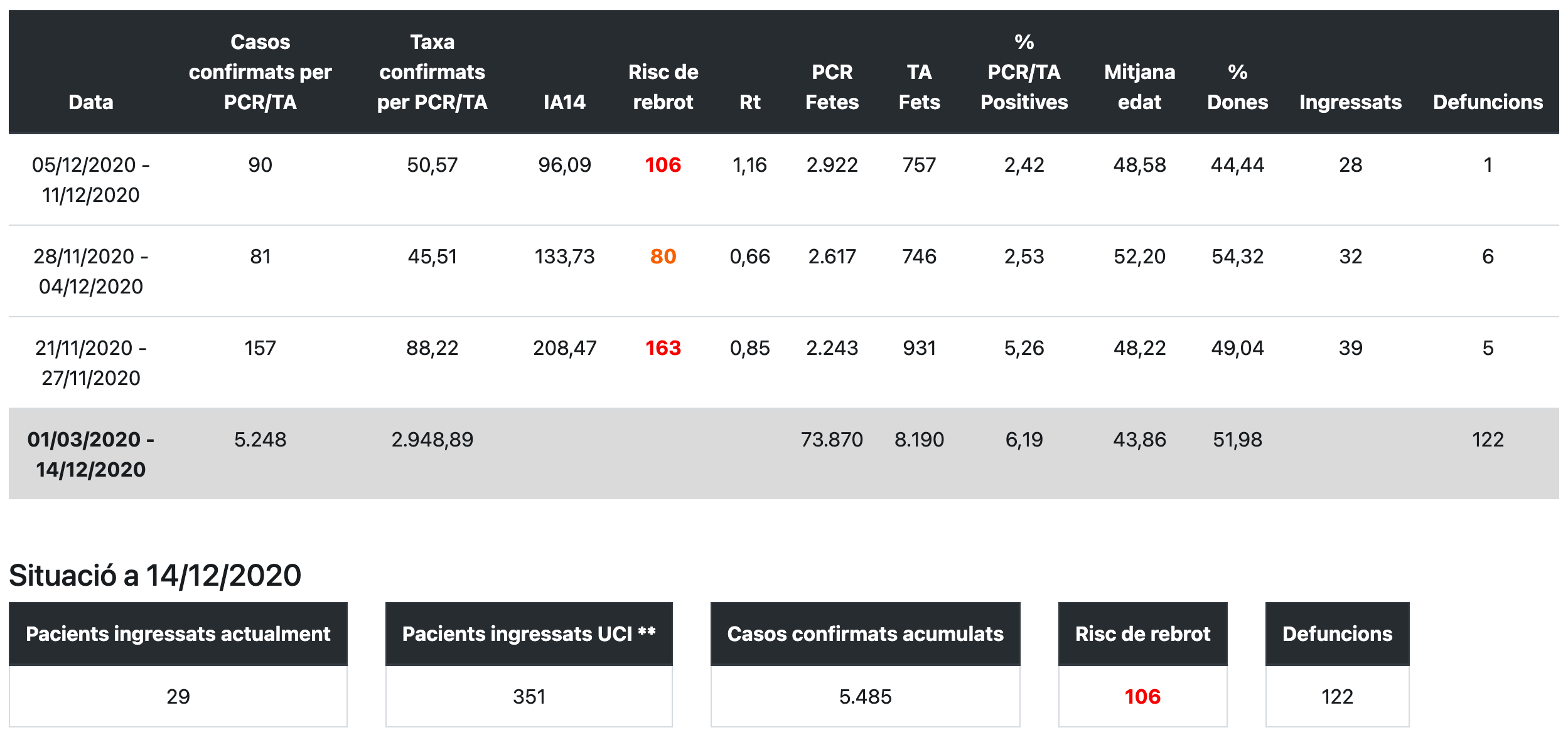 El risc de rebrot puja 22 punts i se situa en 106, per sobre del de la setmana anterior, quan era de 80. Per altra banda, la taxa de confirmats per PCR o test d’antígens entre el 5 i l’11 de desembre és de 50,57 per cada 100.000 habitants. La incidència a 14 dies és de 96, pels 134 de la setmana anterior. El 2,42% de les proves que es fan donen positiu.