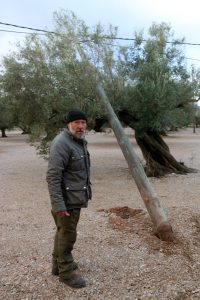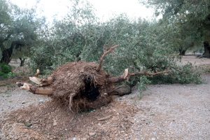 Uns dies després, Altés recorre els bancals assenyalant els colls dels arbres arrencats per la força de l’aire, amb els troncs i les branques escampats per terra. «Tot això és per a llenya: no pots plantar, ni pots fer res», lamenta. A la finca veïna del costat, diverses oliveres més joves van ser arrencades de soca-rel, i també garrofers. «Per recuperar un arbre són molts anys. N’hi ha de centenaris. Això ja mai més ho podrem veure», sentencia.