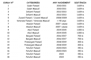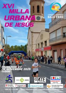 La Milla Urbana de Jesús, la segona del calendari comarcal després de la celebrada al Perelló el passat 25 d’octubre, arrancarà a les 11:00 h amb les curses de la categoria cadet, per continuar amb els infantils, juvenils, veterans i absoluts, tots, tant masculins com femenins fent els 1.609 metres oficials de la milla. A partir d’aquí les distàncies s’escurçaran i els alevins faran 1.000 metres, els benjamins 700 metres, els prebenjamins 300 metres i els patufets 150 metres. Les curses es desenvoluparan pels carrers principals del poble, l’Avinguda Molins d’en Comte i el carrer Daniel Mangrané, amb sortides i arribades des de la zona de la Pèrgola. Hi haurà trofeu per als tres primers classificats en cada categoria i medalla commemorativa per a tots els participants.