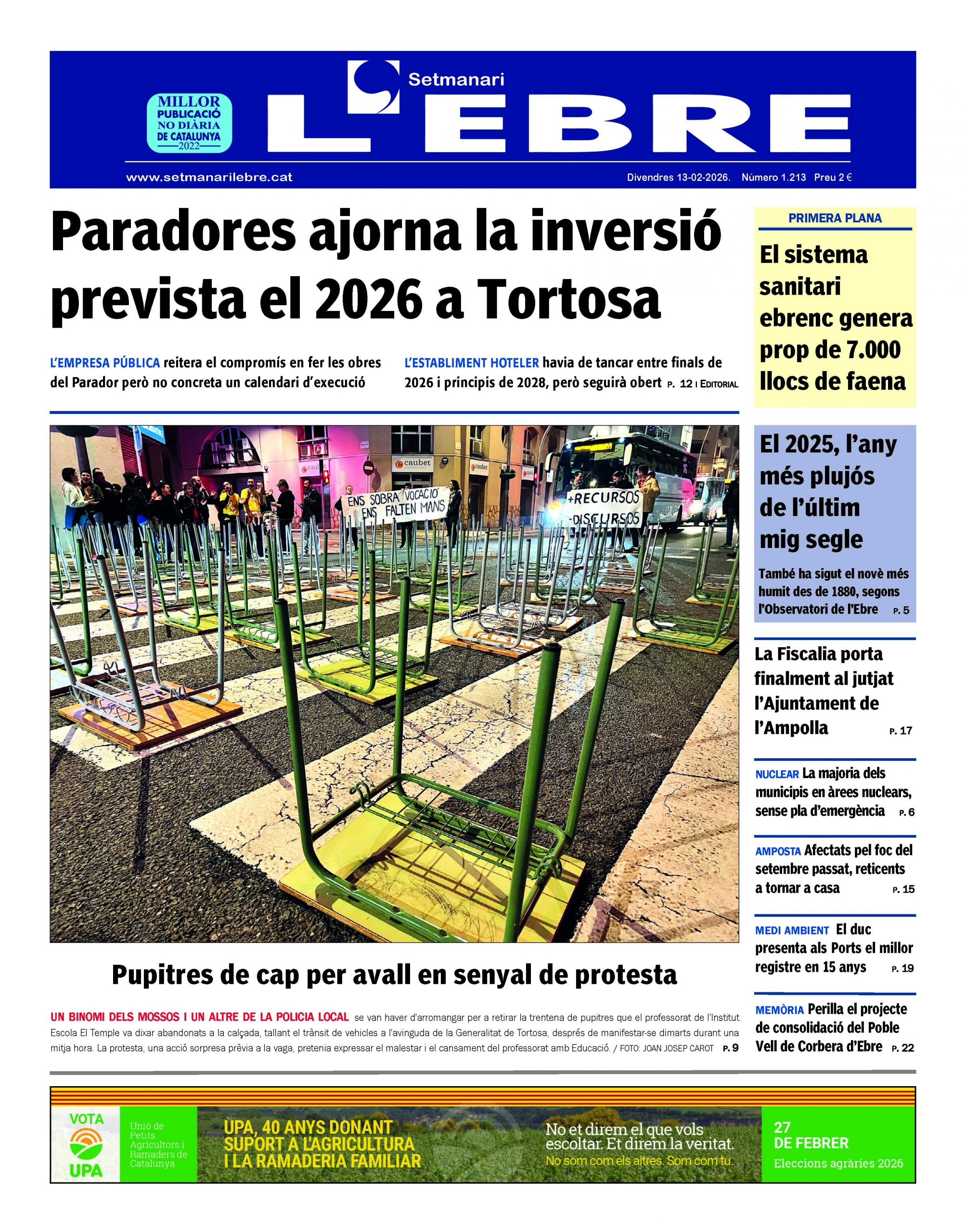 La portada de l’edició en paper número 1213 del Setmanari l’Ebre dedica el titular principal de portada a una de les principals polèmiques de la setmana a Tortosa: l’ajornament de la inversió prevista per a reformar l’hotel del Parador de Tortosa. Tot i que l’empresa pública Paradores haja reiterat el seu compromís en fer les obres, ara no ha concretat cap calendari, després que havia previst fer-les entre finals de 2026 i principis de 2028, i ha reobert les reserves per a este període.