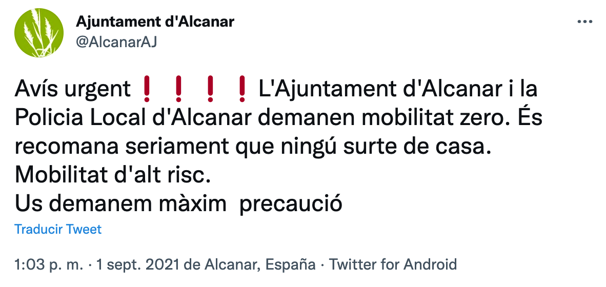 L’Ajuntament d’Alcanar i la Policia Local han emès un avís urgent a tota la població perquè ningú surti de casa ni es mobilitzi pels carrers per les greus inundacions que afecten el municipi. En tan sols 2 hores han caigut 141 litres per metre quadrat. Segons ha informat Protecció Civil, prop de 10.000 usuaris s’han quedat sense electricitat a dos quarts de dues del migdia. Qualsevol persona que necessiti ajuda ha de trucar al 112.