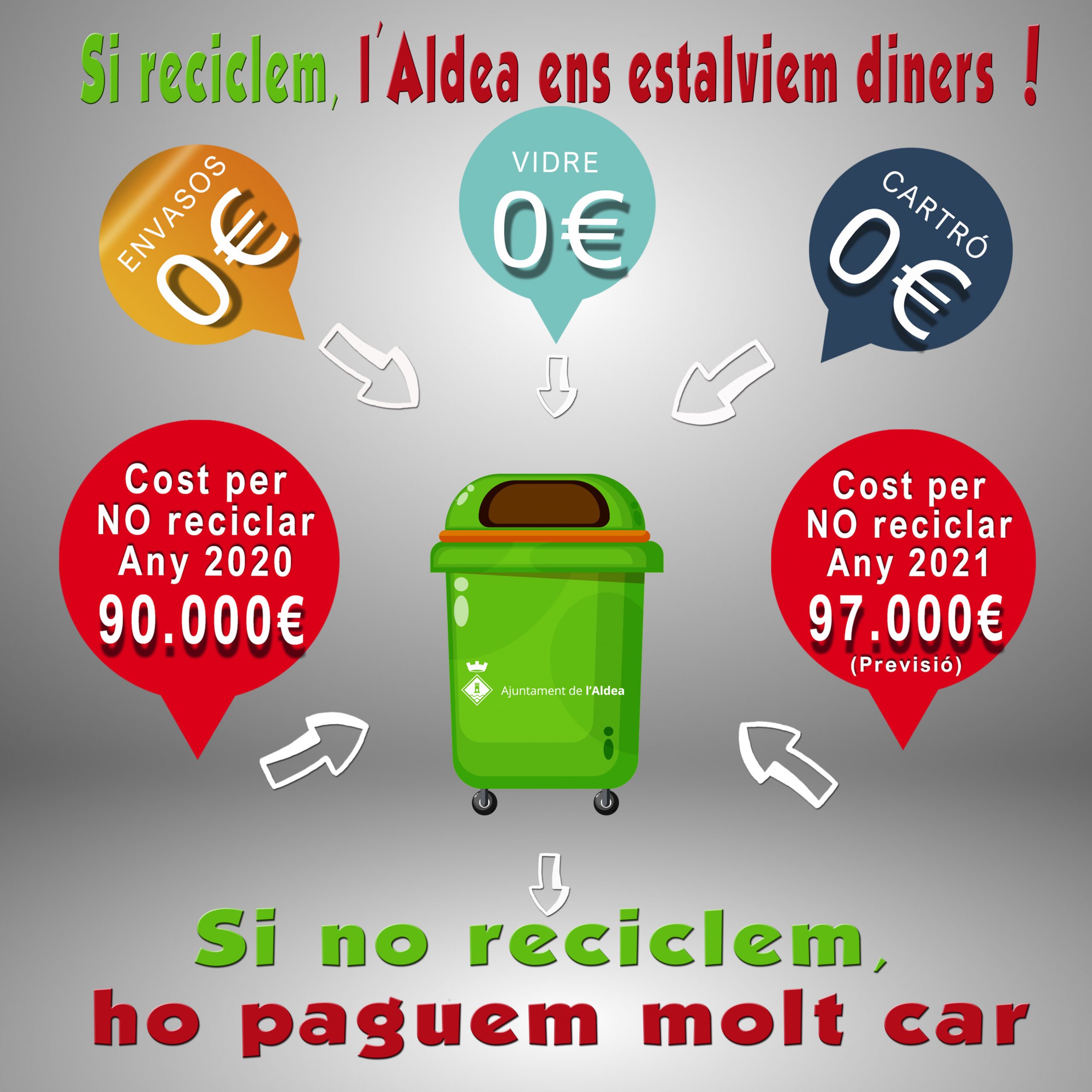 La campanya consisteix a fer arribar a tots els domicilis i a les xarxes socials unes infografies on s’informa del cost que representa no reciclar adequadament, a més s’han instal·lat als contenidors de la resta, unes infografies informant “si no recicles ens costa diners” a part d’ubicar senyalitzacions indicant el punt més prop on pots reciclar.