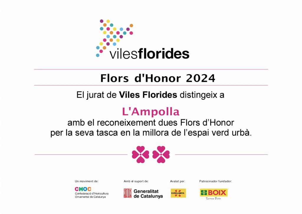 Aquest premi, atorgat per la Confederació Ornamental de Catalunya (CHOC), valora criteris com la qualitat del patrimoni vegetal, la diversitat floral i el respecte pel medi ambient. L’Ampolla es va unir al moviment Viles Florides el novembre de 2022, sent