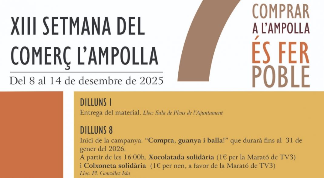 L’Ampolla viurà del 8 al 14 de desembre la XIII Setmana del Comerç i la III Fireta de Nadal, dos esdeveniments plens d’activitats, música, tallers i ambient festiu. Enguany, la Setmana del Comerç destaca pels 40 establiments que s’han adherit a la campanya, assolint el rècord de participació i reforçant el lema de l’edició, ‘Comprar a l’Ampolla és fer poble‘, que impulsa el comerç de proximitat.