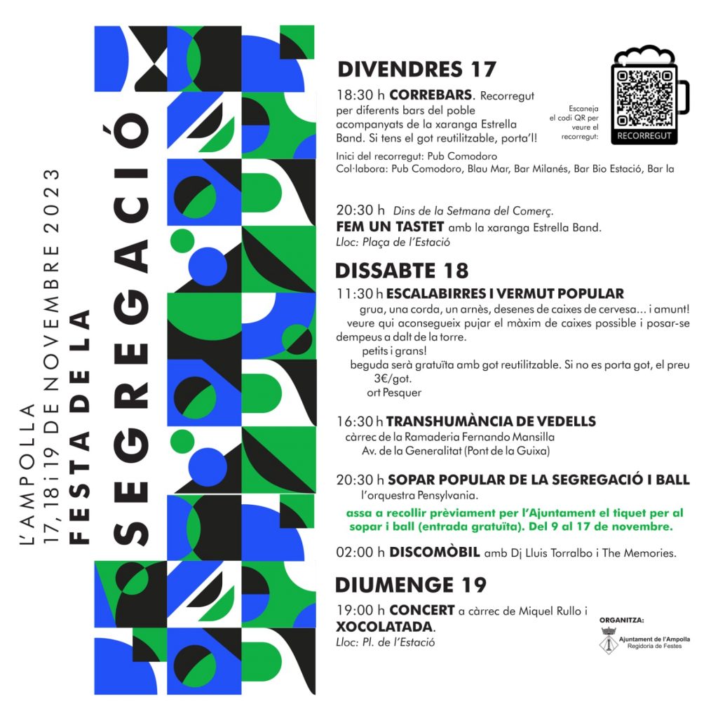 El dissabte 18 de novembre coincidint amb la Festa de la Segregació, a les 11.30 hores, al port pesquer, hi haurà la prova escalabirres i un vermut popular. A les 16.30 hores, tindrà lloc la transhumància de vedells a càrrec de la ramaderia Fernando Mansilla, l’inici serà a l’avinguda de la Generalitat (Pont de la Guixa). A les 20.30 hores, al Casal Municipal de l’Ampolla, tindrà lloc el sopar popular de la Segregació i ball amb l’orquestra Pensylvania, a les 2 de la matinada hi haurà discomòbil amb Dj. Lluís Torralbo i The Memories. Totes les persones empadronades a l’Ampolla interessades a anar al sopar han de recollir l’entrada, que és gratuïta, a l’Ajuntament en horari de dilluns a divendres de 9 a 13 hores. Hi ha de temps fins al 17 de novembre.