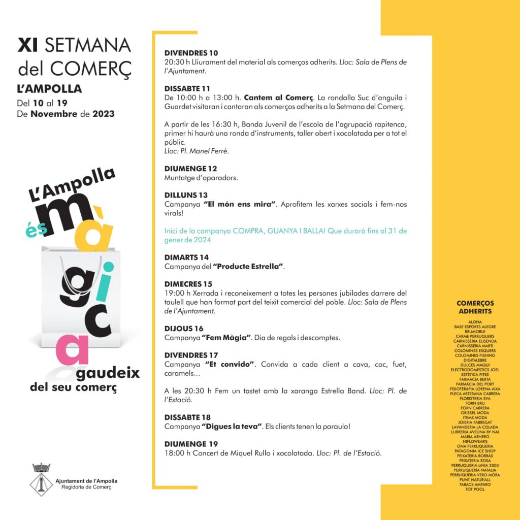 El tret de sortida a la XI Setmana del Comerç, que enguany porta per lema L’Ampolla és màgica, gaudeix del seu comerç, va ser el divendres 10 de novembre, a les 20.30 hores, a la sala de plens de l’Ajuntament de l’Ampolla, on es va distribuir el material que la Regidoria de Comerç de l’Ajuntament de l’Ampolla ha preparat per als comerciants que hi participen. Així, de l’11 al 19 de novembre, els 36 comerços del municipi adherits a la iniciativa decoraran els seus aparadors i oferiran ofertes i promocions preparades per a l’ocasió. El dissabte 11 de novembre, durant el matí, la Rondalla Suc d’Anguila i Guardet van alegrar amb la seva música els carrers i establiments de la població. A la tarda, la Banda Juvenil, dirigida per Antoni Alburquerque, i el Conjunt instrumental de l’Escola de l’Agrupació Musical Rapitenca va fer una roda d’instruments per conèixer els instruments de banda i van oferir un concert obert al públic.