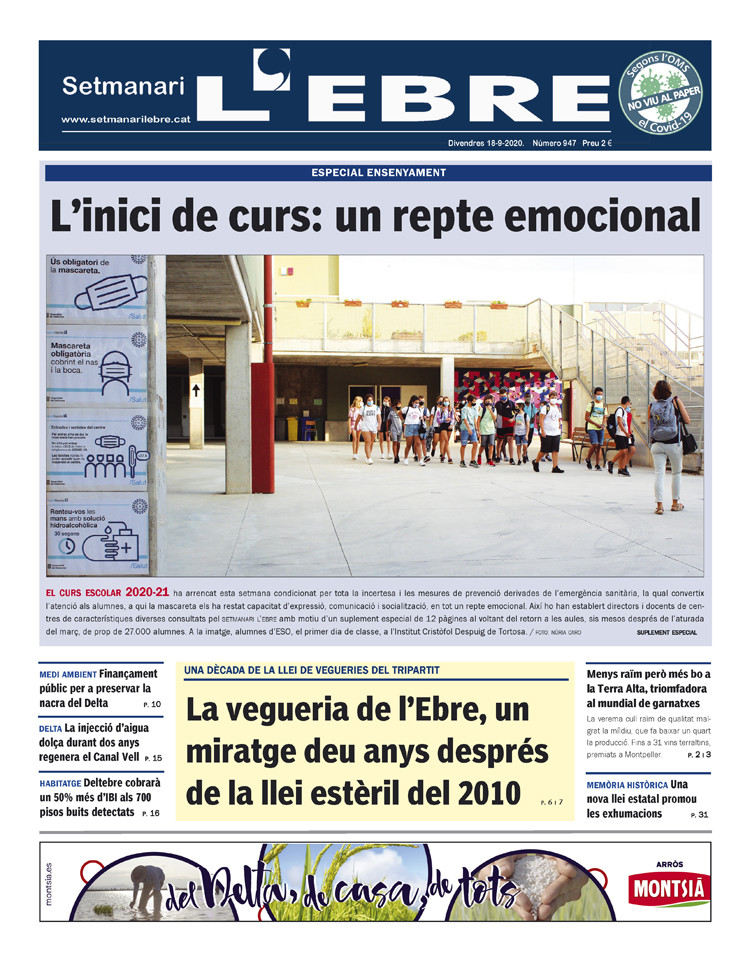 L’edició en paper número 947 del Setmanari L’EBRE dedica el titular i la fotografia principal de la portada a l’inici del nou curs escolar marcat per la pandèmia pel coronavirus, que mereix en esta edició un suplement de 12 pàgines en què es dona veu entre altres a docents i directors de centre.