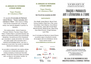 Del 18 al 22 de novembre, Tortosa acollirà una nova edició de les Jornades de Patrimoni Literari Ebrenc, que enguany es dedicaran als vincles entre l’art i la literatura. La biblioteca Marcel·lí Domingo serà l’escenari principal d’una programació que posarà en diàleg la creació plàstica i l’escriptura, amb una mirada especial a l’empremta artística de pintors com Antoni Casanova, Francesc Gimeno, Ferran Arasa, Miquel Paton, Frederic Mauri o Leonardo Escoda.