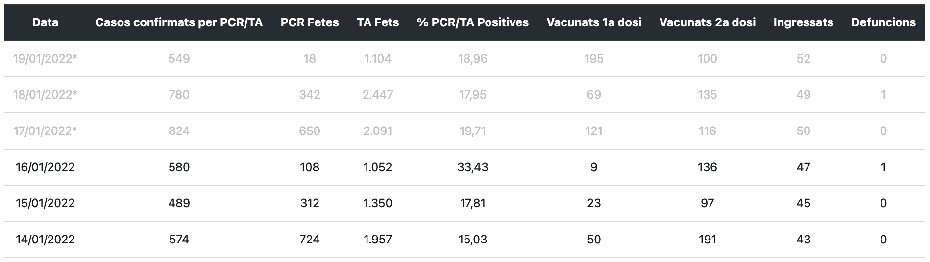 Segons dadescovid.cat, actualment hi ha 63 persones ingressades per Covid-19, tres més que ahir, 11 de les quals a l’UCI. A les Terres de l’Ebre han mort 218 persones des de l’inici de la pandèmia, una més. Les últimes defuncions daten del 16 i el 18 de gener. La incidència a 7 dies és de 2.375 i a 14 dies és de 4.290. El 19,84% de les proves que es fan donen positiu.