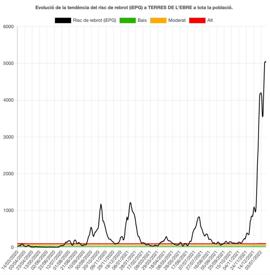 La pandèmia segueix en augment, ja que la velocitat de contagi (Rt) supera l’1, però baixa dues centèsimes fins a 1,18 i el risc de rebrot puja 75 punts fins a 5.059 (risc molt alt). En cap moment de la pandèmia s’havien superat els 5.000 punts a les Terres de l’Ebre. Tenen un risc molt alt les quatre comarques: la Ribera d’Ebre de 2.820, el Montsià de 5.821, la Terra Alta de 5.515 i el Baix Ebre de 5.025.